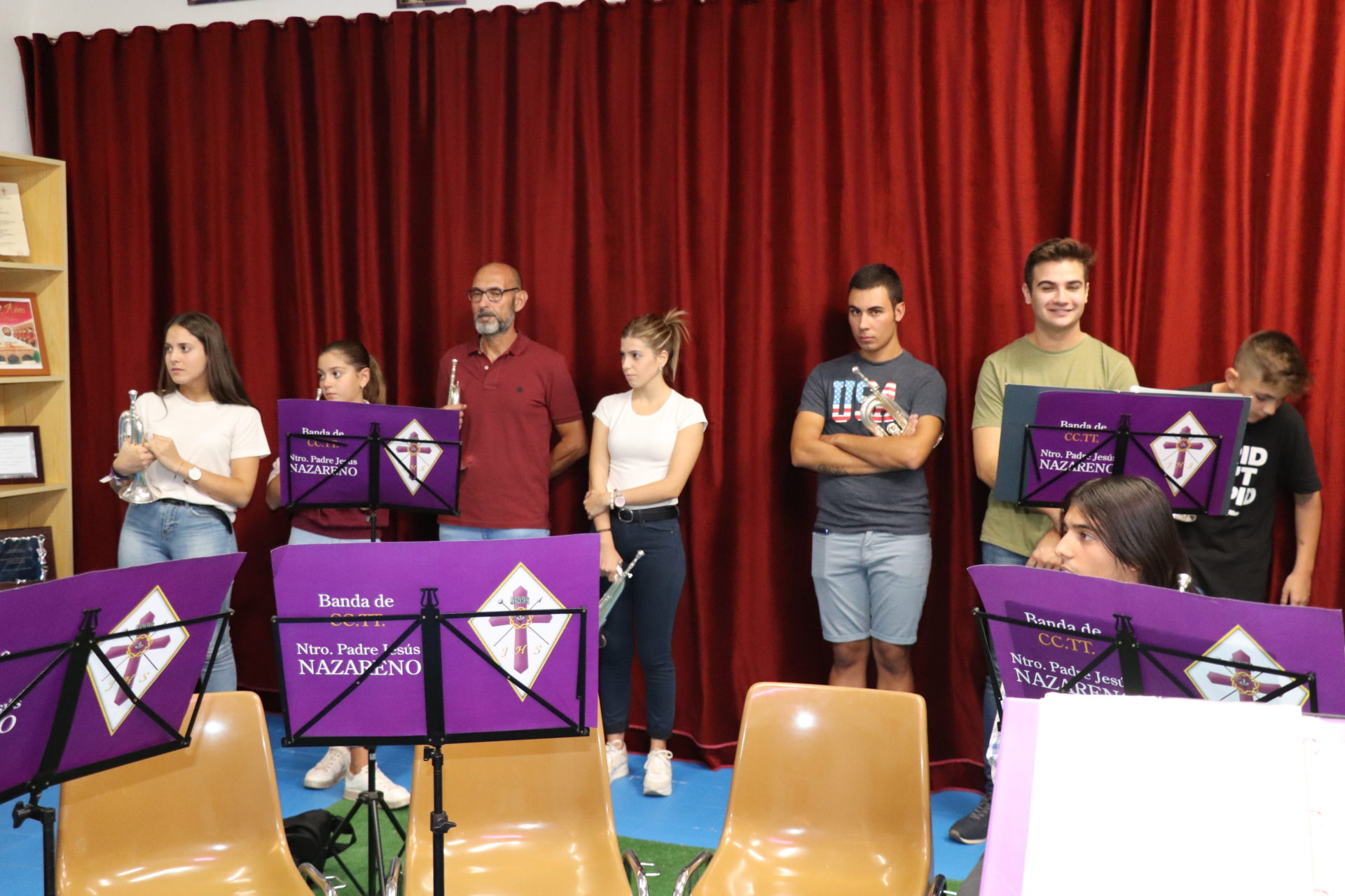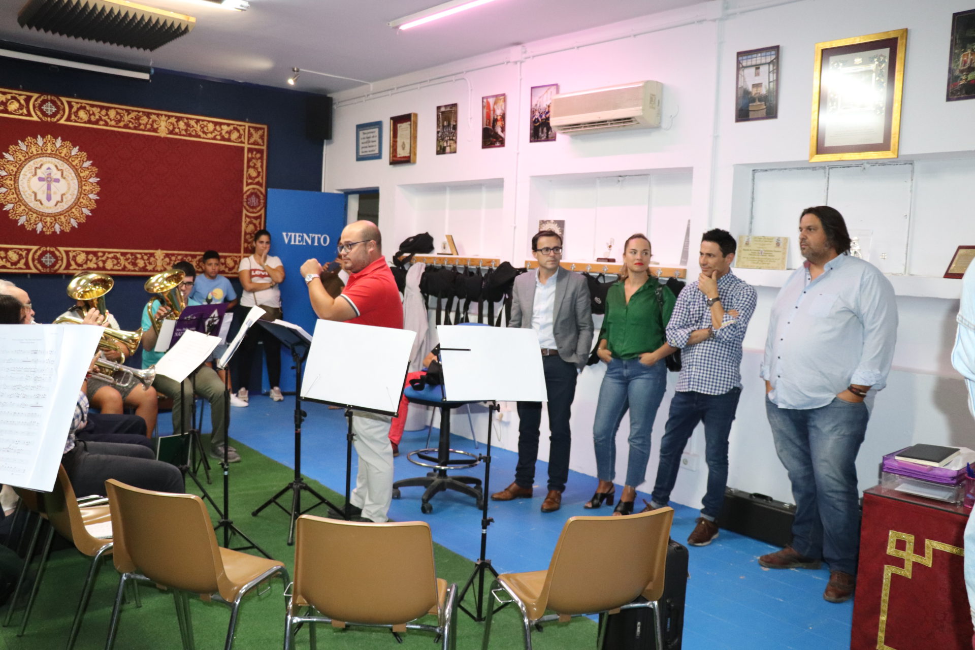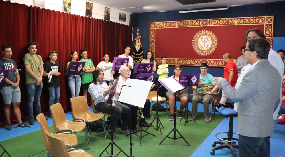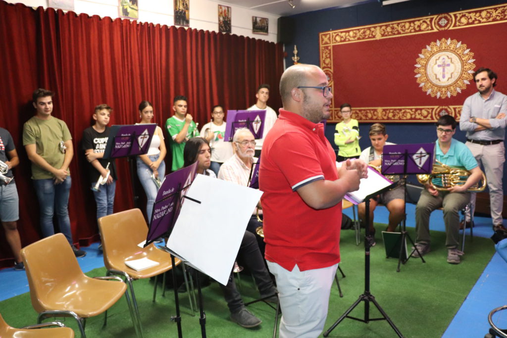 El local de ensayo recién reformado es un punto de encuentro en el que cuatro días en semana se reúnen fundamentalmente para ensayar, pero también para hacer hermandad, tal como explica el director de la Banda, Andrés Pino. Destaca el trabajo que todos hacen a lo largo del año, reconociendo especialmente la implicación que los padres tienen, participando en todo lo que se les pide colaboración.