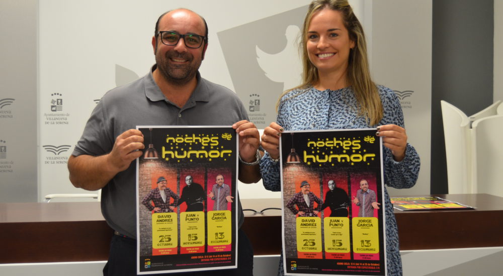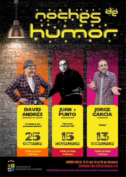 David Andrés, Juan y Punto y Jorge García, serán los tres humoristas que actuarán en el ciclo de noches de humor que se desarrollará desde el mes de octubre hasta diciembre. Una iniciativa, señala Ana Mansanet, concejal de Cultura, destinado al público en general y en especial a los jóvenes. Todos se llevarán a cabo en el Teatro Las Vegas a las 21:00 horas.