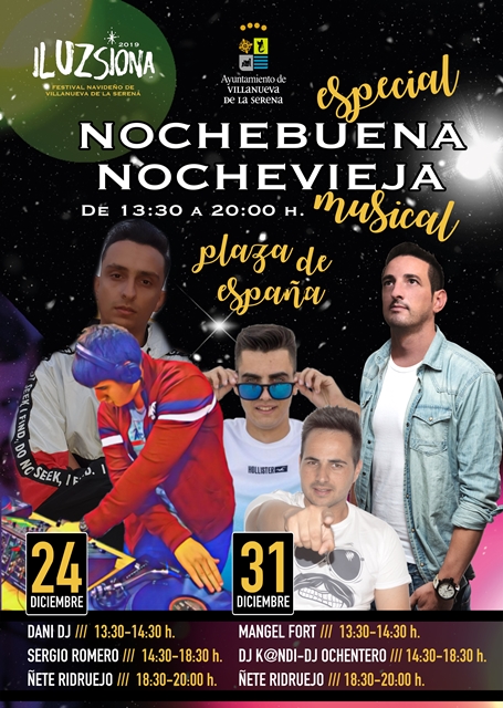 Por tercer año consecutivo, los próximos días de Nochebuena y Nochevieja las personas que se den cita en la plaza de España para disfrutar de estos dos días festivos, contarán con la música de diferentes DJ locales. Una actividad que organiza la concejalía de Juventud y que se desarrolla en horario de 13:30 a 20 horas.