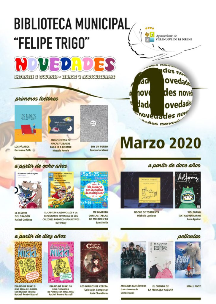 Con respecto a las novedades para adultos se pueden encontrar títulos como “Cambiar de idea” de Aixa de la Cruz, “Porciones de felicidad” de Anne Ostby, “La princesa fiel” de Philippa Gregory, “Hermanas de hielo” de S.L. Tremayne, “Violetas de marzo” de Philip Kerr, “Las hijas de la tierra” de Alaitz Leceaga, “La isla de las mil historias” de Catherine Banner, “Mr Gwyn” de Alessandro Baricco, “A los extremeños qué nos pasa para estar donde estamos…” de Luis Ángel Ruíz de Gopegui, “Agatha Christie” de María Romero, “Historia de la Palestina moderna.. Un territorio, dos pueblos” de Ilan Pappe, “El folklore de Villanueva de la Serena” de Sebastián Morales Jiménez y “Por un anfibio sendero…” de Javier Salazar Rincón.