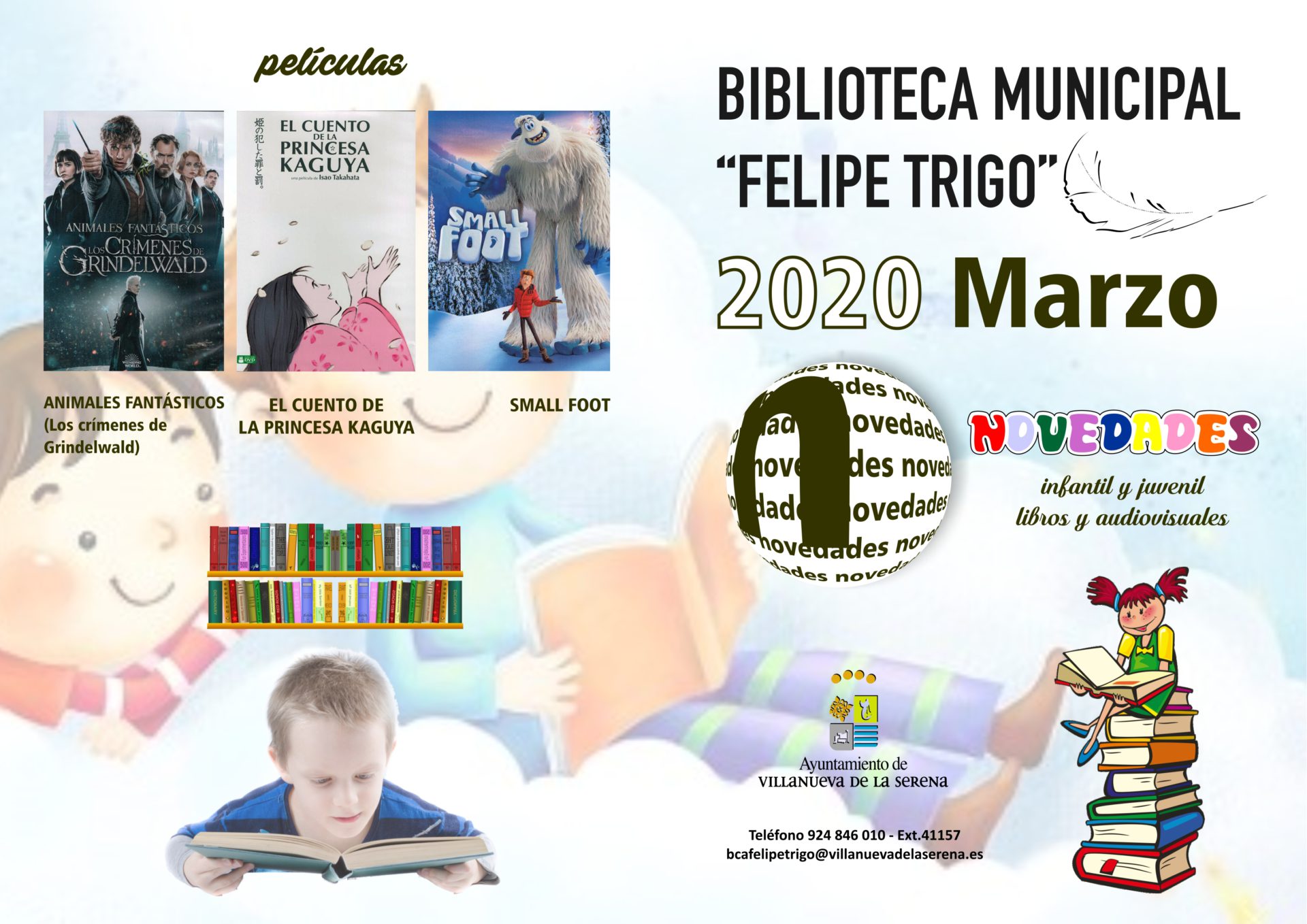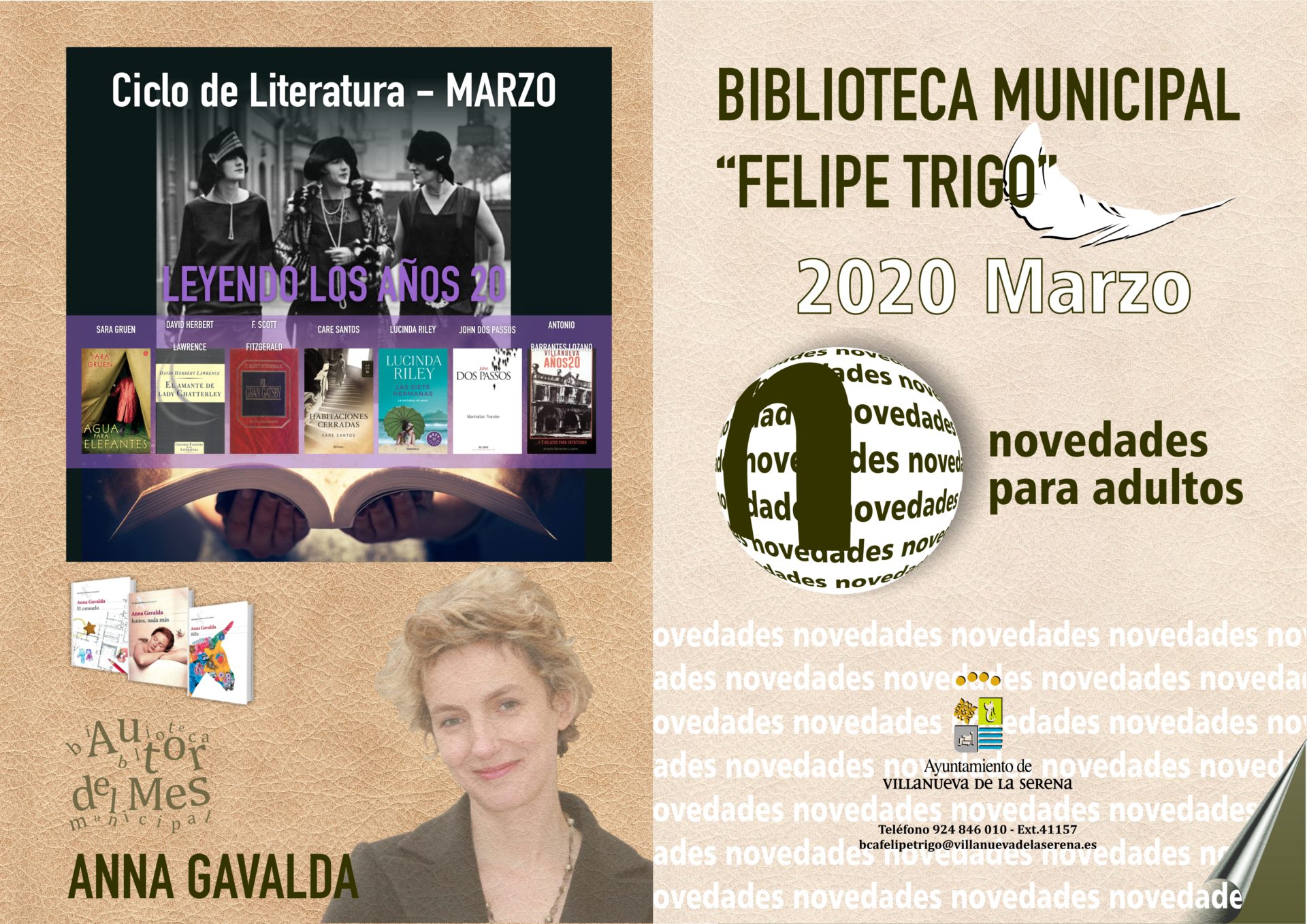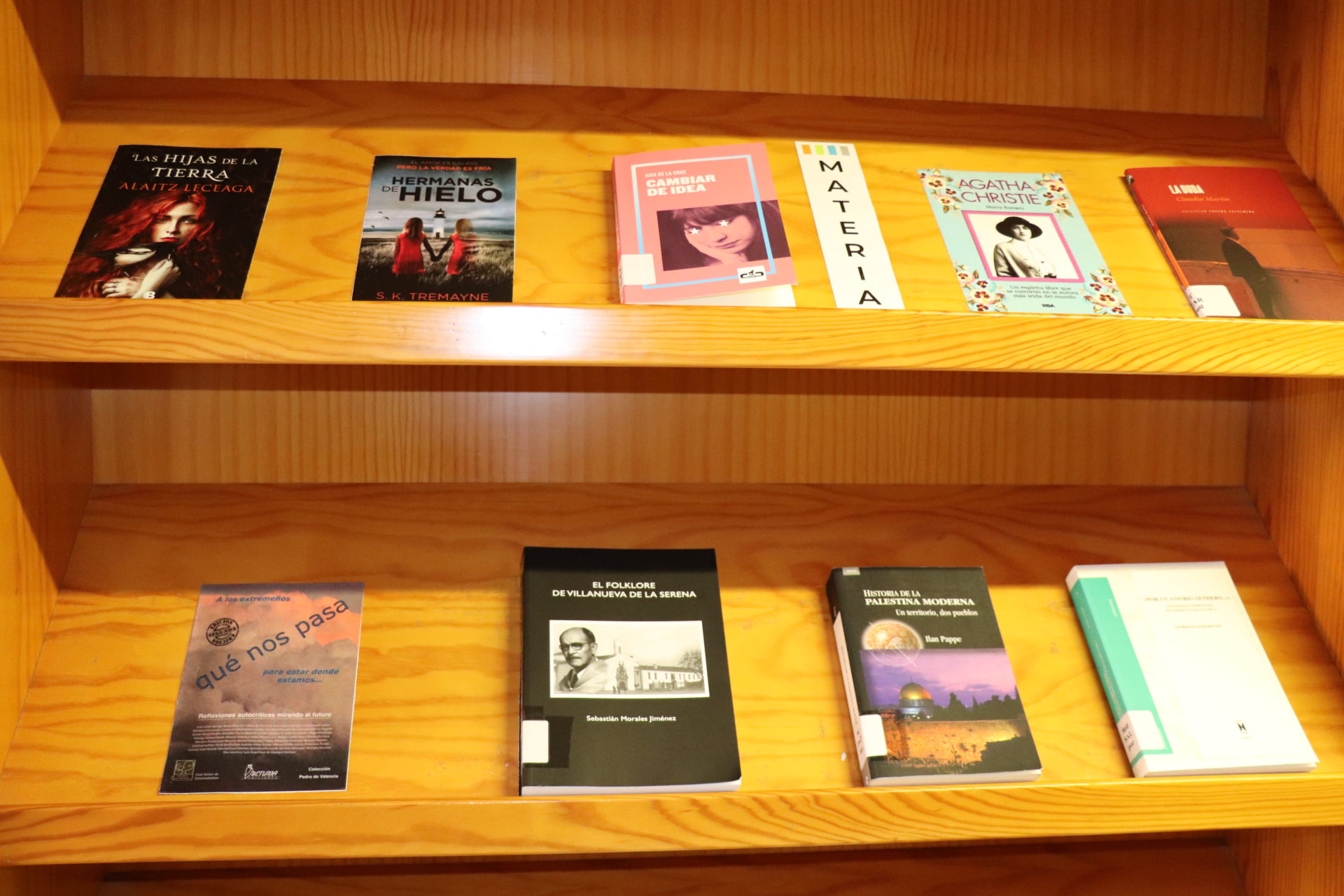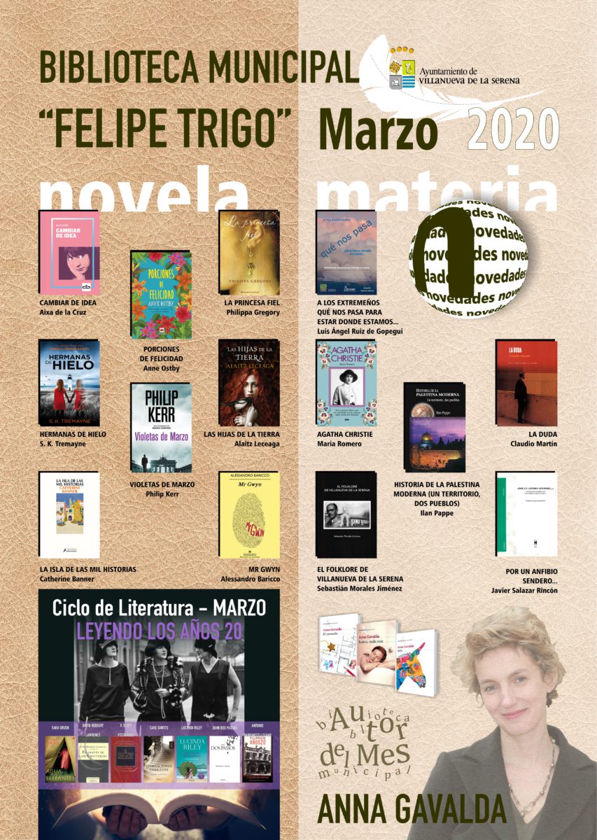 Con respecto a las novedades para adultos se pueden encontrar títulos como “Cambiar de idea” de Aixa de la Cruz, “Porciones de felicidad” de Anne Ostby, “La princesa fiel” de Philippa Gregory, “Hermanas de hielo” de S.L. Tremayne, “Violetas de marzo” de Philip Kerr, “Las hijas de la tierra” de Alaitz Leceaga, “La isla de las mil historias” de Catherine Banner, “Mr Gwyn” de Alessandro Baricco, “A los extremeños qué nos pasa para estar donde estamos…” de Luis Ángel Ruíz de Gopegui, “Agatha Christie” de María Romero, “Historia de la Palestina moderna.. Un territorio, dos pueblos” de Ilan Pappe, “El folklore de Villanueva de la Serena” de Sebastián Morales Jiménez y “Por un anfibio sendero…” de Javier Salazar Rincón.