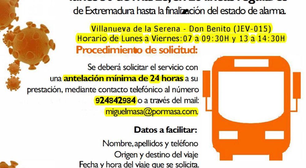 El transporte de viajeros por autobús en la línea Villanueva – Don Benito, será a demanda a partir del lunes 30 de marzo hasta la finalización del estado de alarma. Una medida con la que la Junta de Extremadura pretende minimizar la exposición de los viajeros al virus.