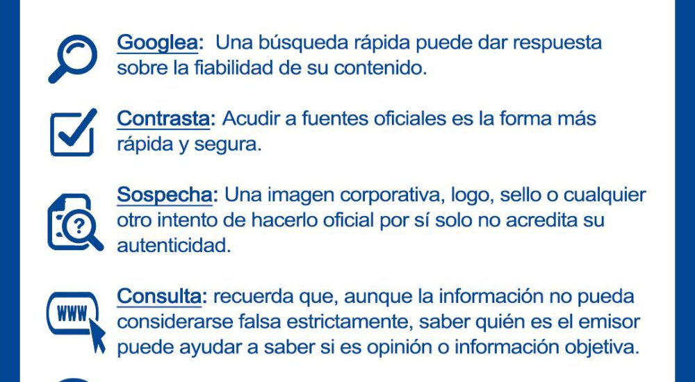 Contrastar información, para ello hay que acudir a fuentes oficiales ya que es la forma mas rápida y segura. Además, señalan que una imagen corporativa, logo, sello o cualquier otro intento de hacerlo oficial por si solo, no acredita su autenticidad.