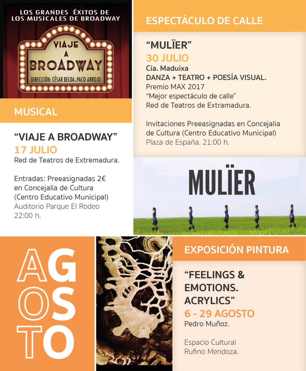 Para finalizar el mes, el 30 de julio en la plaza de España, la compañía Maduxa presenta “Mulier”. Una obra que engloba danza, emociones y poesía que recibió el Premio Max 2017 al mejor espectáculo de calle.