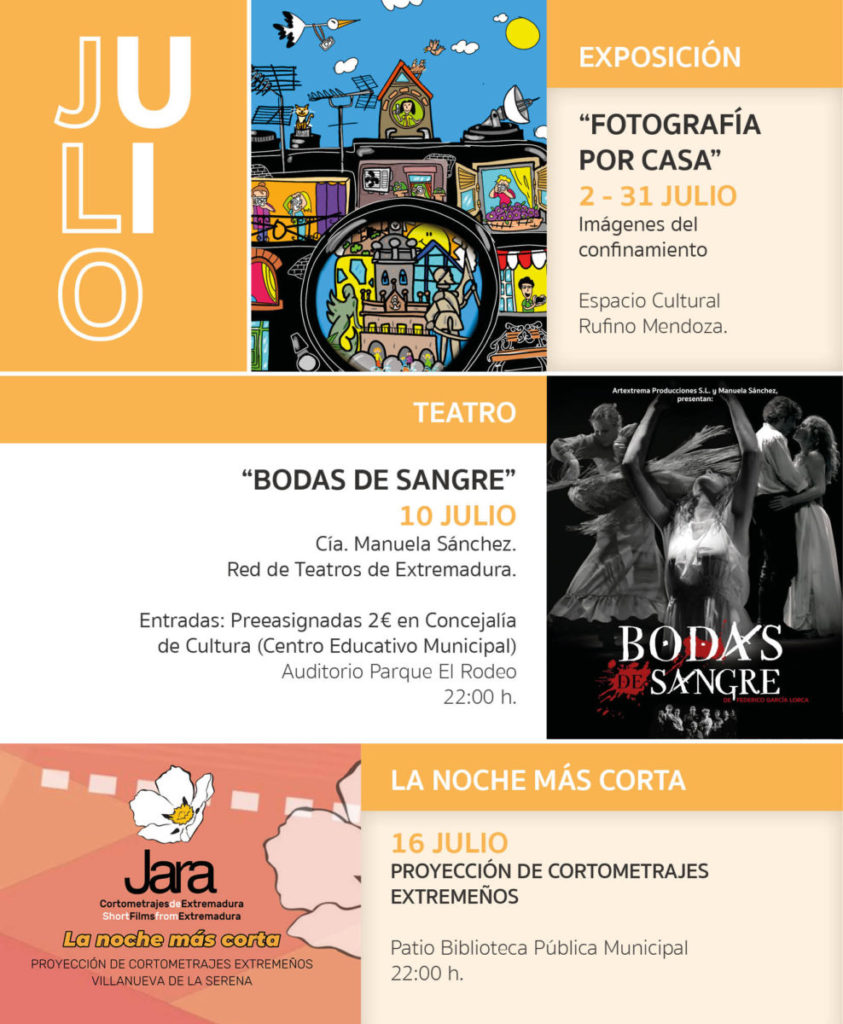 Con respecto a las artes escénicas, el viernes 10 de julio, el auditorio del parque de El Rodeo acogerá “Bodas de Sangre” de la compañía de Manuela Sánchez, las entradas ya están agotadas.