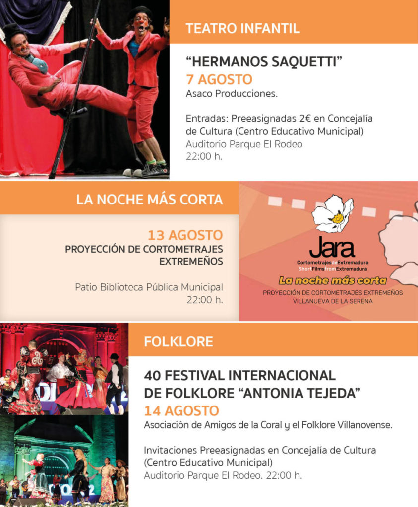 Por otro lado, la Asociación de Amigos de la Coral y Folklore Villanovense, organiza el 40 Festival Internacional de Danza Folklórica Antonia Tejeda, se celebrará en el parque de El Rodeo. Un festival, debido a las circunstancias, ha cambiado de formato, el carácter internacional lo aportarán distintas agrupaciones que, mediante vídeos, mostrarán sus bailes.
