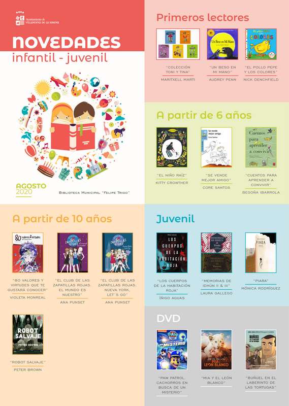 Para los más pequeños son varias novedades de las que podrán disfrutar, entre los que se encuentran, “Colección Toni y Tina” de Maritxell Marti, “Un beso en mi mano” de Audrey Penn, “El pollo Pepe y los colores” de Nick Denchfield, “El niño raíz” de Kitty Crowther, “Se vende mejor amigo” de Core Santos, “Cuentos para aprender a convivir” de Begoña Ibarrola, “80 valores y virtudes que te gustará conocer” de Violeta Monreal, “El club de las zapatillas rojas. El mundo es nuestro” de Ana Punset, “El club de las zapatillas rojas. Nueva York, let´s go” también de Ana Punset, “Robot salvaje” de Peter Brown, “Los cuerpos de la habitación roja” de Íñigo Aguas, “Memorias de Idhún II & III” de Laura Gallego y “Piara” de Mónica Rodríguez.