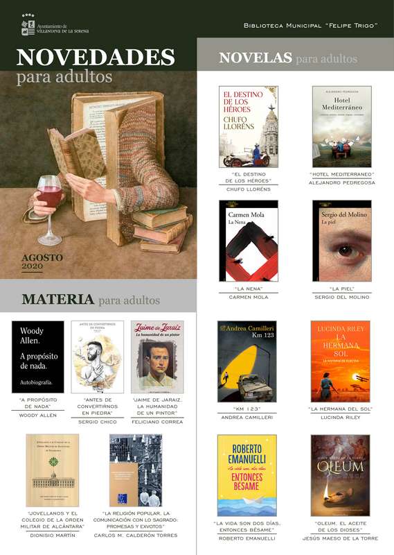 Por lo que respecta de las novedades para adultos, se pueden encontrar “El destino de los héroes” de Chufo Lloréns, “Hotel mediterráneo” de Alejandro Pedregosa, “La nena” de Carmen Mola, “La piel” de Sergio del Molino, “Km 123” de Andrea Camilleri, “La hermana del sol” de Lucinda Riley, “La vida son dos días, entonces bésame” de Roberto Emanuelli, “Oleum. El aceite de los dioses” de Jesús Maeso de la Torre, “A propósito de nada” de Woody Allen, “Antes de convertirnos en piedra” de Sergio Chico, “Jaime de Jaraíz. La humanidad de un pintor” de Feliciano Correa, “Jovellanos y el colegio de la orden militar de Alcántara” de Dionisio Martín y “La religión popular, la comunicación con lo sagrados, promesas y exvotos” de Carlos Calderón Torres.