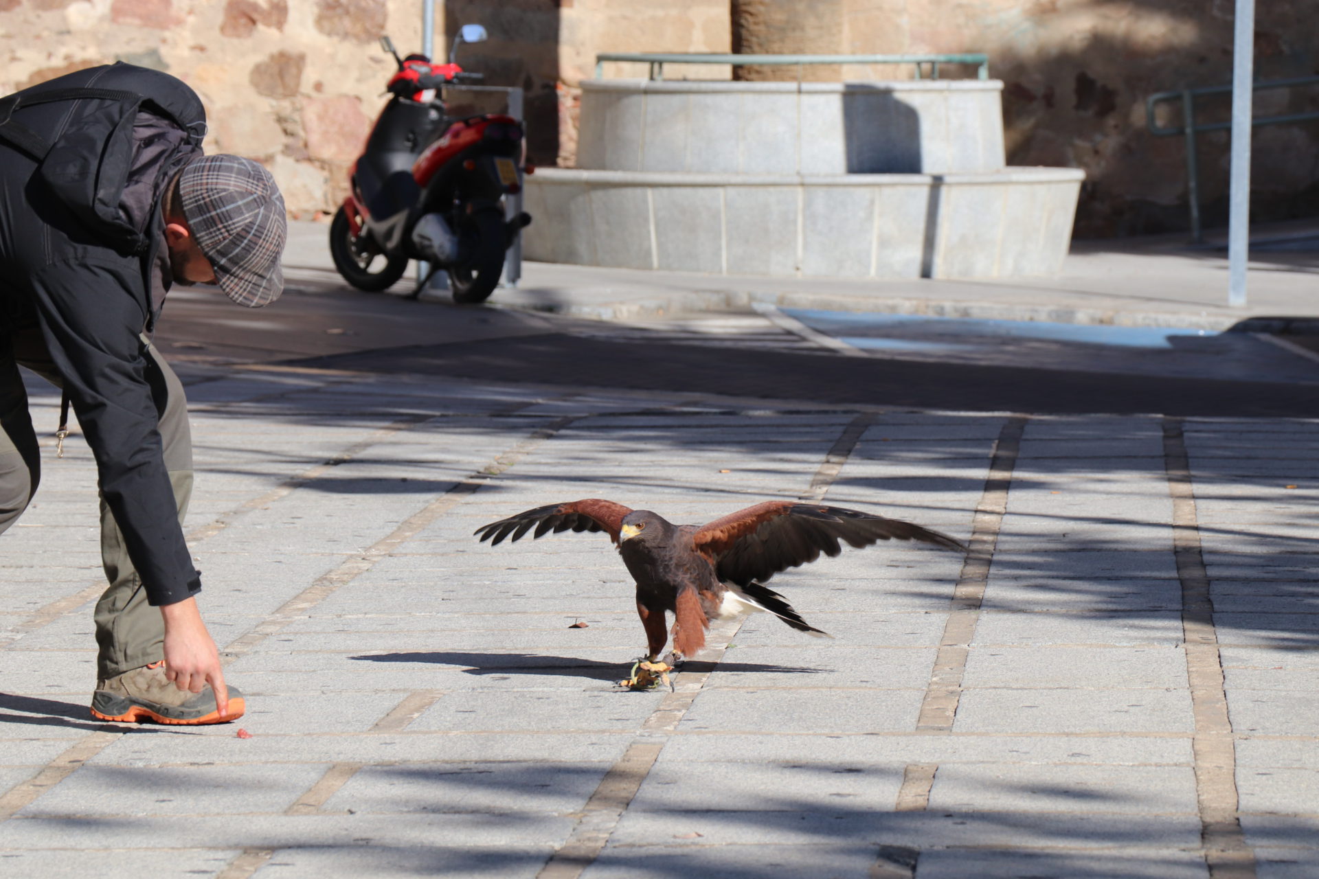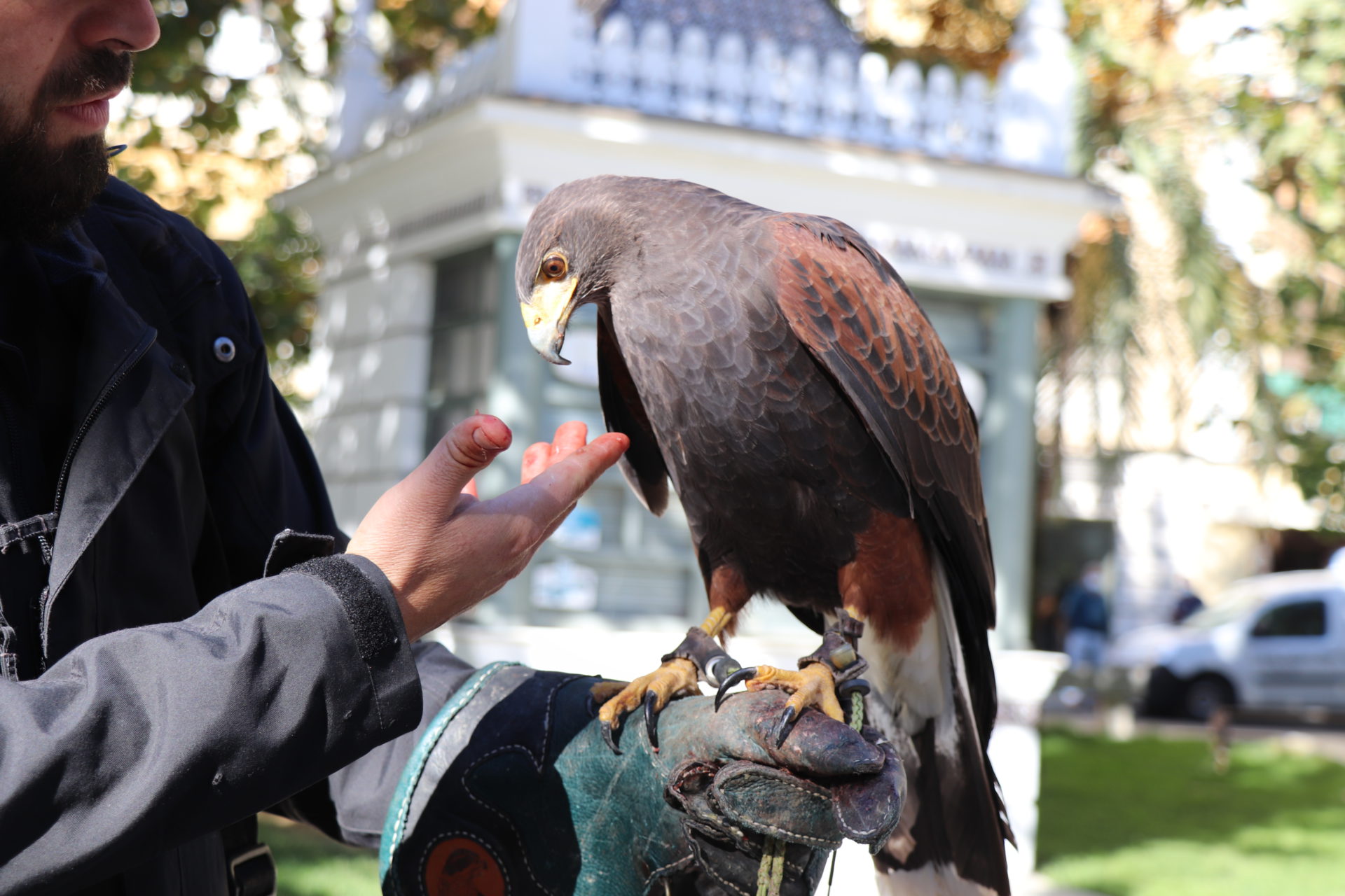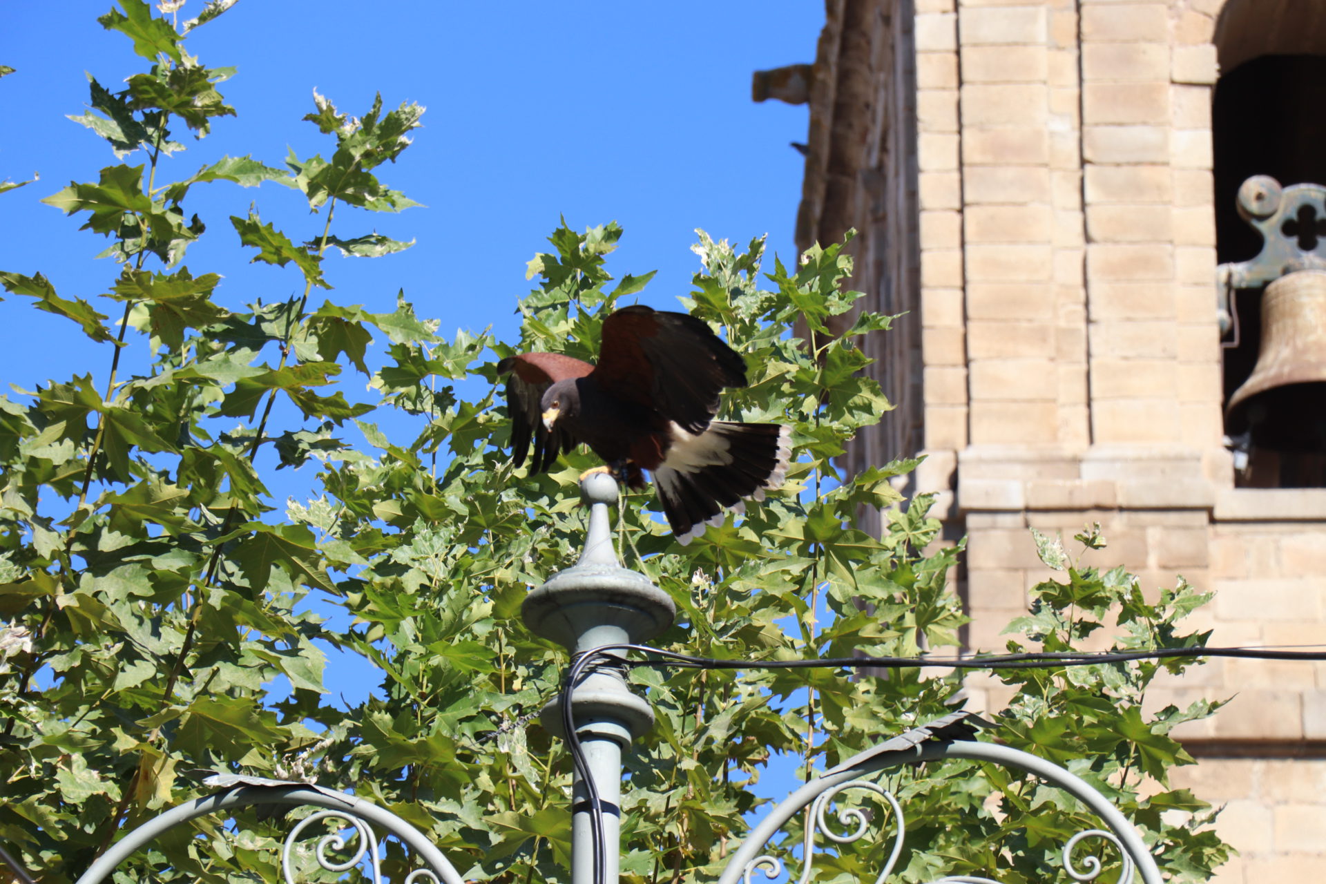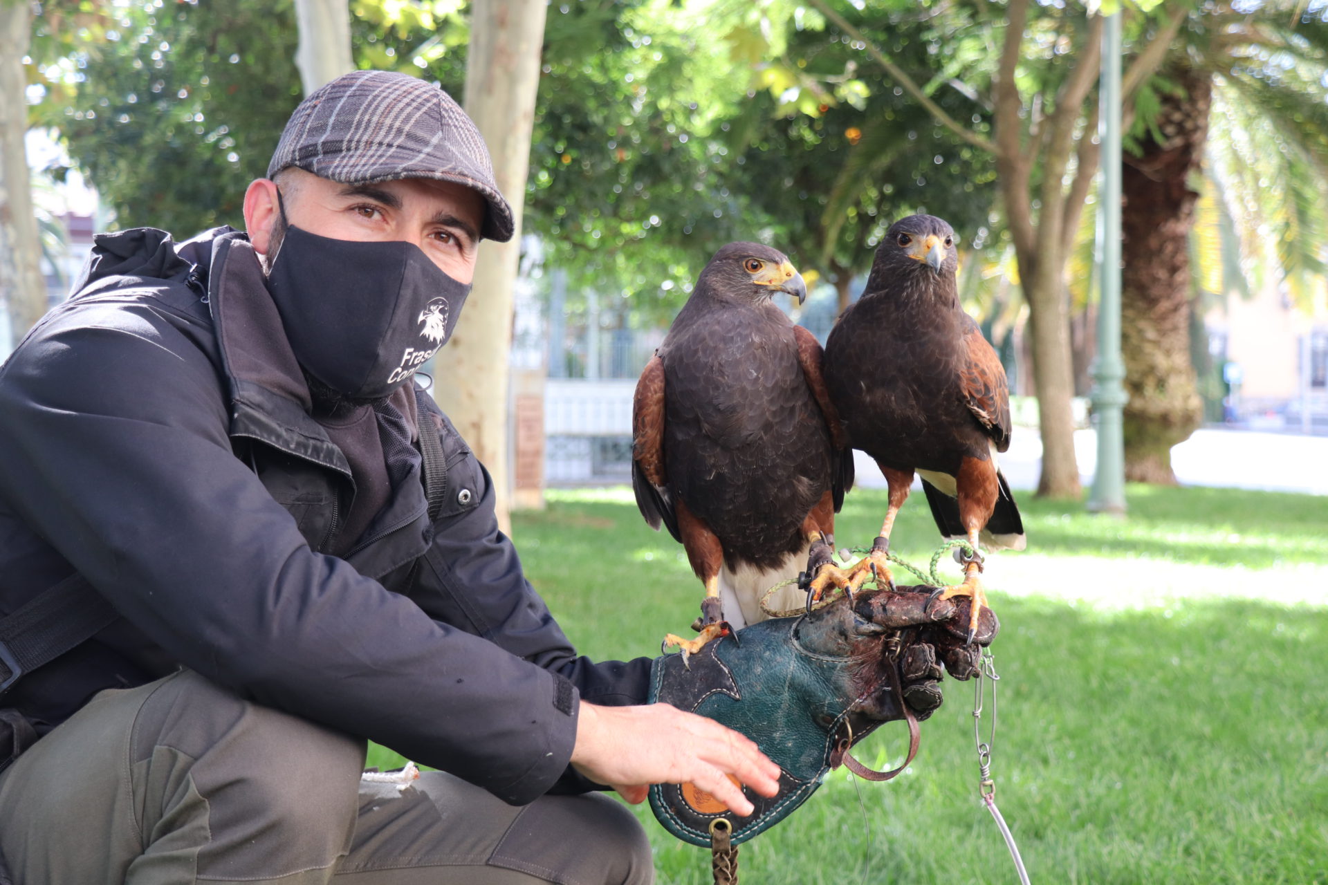El Ayuntamiento ha contratado a una empresa de cetrería para ahuyentar con águilas, azores y halcones, a las palomas que se encuentran en la ciudad y que ocasionan molestias a los vecinos. Se trata de una iniciativa complementaria a la ya adoptada anteriormente que no es otra que la ubicación de jaulas por distintas zonas. Hoy viernes 16 de octubre ha sido la toma de contacto del primer animal en la ciudad, un águila de Harris que ha sobrevolado el parque de la Constitución con el objetivo de familiarizarse con el entorno y empezar a hacer el marcaje, aunque serán un total de cinco las aves rapaces que participarán.