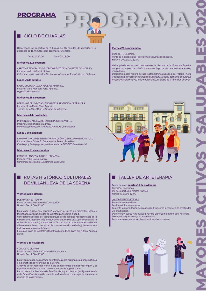 El día 26, la charla será sobre salud bucodental en adultos mayores impartida por María Manuela Pérez, higienista bucodental. El miércoles 28 la técnica de la O.M.I.C Rosa María Pérez, impartirá un curso sobre derechos de los consumidores y prevención de fraudes mientras que el 4 de noviembre, Juliana Cabrera, especialista en medicina familiar y comunitaria hablará sobre la prevención y los cuidados en tiempos de covid 19. El lunes 9 de noviembre, se llevará a cabo una charla sobre la importancia del bienestar psicológico en el momento actual impartido por Paula Calderón y Ana Sereno, psicóloga y pedagoga respectivamente. El ciclo de charlas finalizará el miércoles 11 de noviembre con una charla impartida por Pablo García García, cardiólogo del Hospital Don Benito -Villanueva denominada “Escucha las señales de tu corazón”.