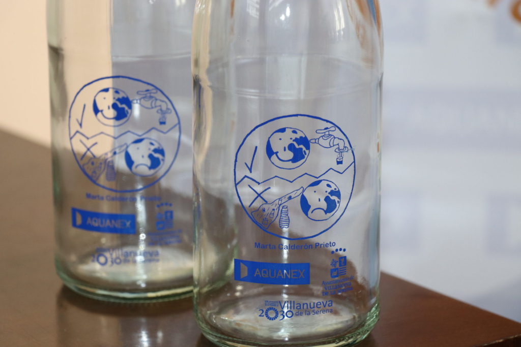 Este miércoles 21, Marta Calderón ha recibido de manos del alcalde Miguel Ángel Gallardo, y de la gerente de concesiones de Badajoz Aquanex, Marta Nieto Carrero, el premio que consta de un diploma y una Tablet. El dibujo ganador del concurso, en el que han participado un total de 179 escolares de 9 a 12 años, de 4º a 6º de Primaria, de los colegios San José, Santiago Apóstol, El Cristo, Cruz del Río, Miguel de Cervantes y Conquistadores; se ha convertido en el logo utilizado para serigrafiar un total de 1.000 botellas de agua. Se van a repartir de forma gratuita en los centros escolares de nuestra localidad, dentro de una campaña de concienciación del fomento del consumo del agua del grifo y los ODS (objetivos de desarrollo sostenible). En esta campaña se hará referencia no solo a la importancia del ahorro y el cuidado del agua, sino también a la importancia de la utilización de botellas reutilizables, en este caso de vidrio, en sustitución de botellas de plástico de un solo uso; fomentando así un consumo responsable y una reducción de los residuos generados como consecuencia del consumo de agua embotellada.