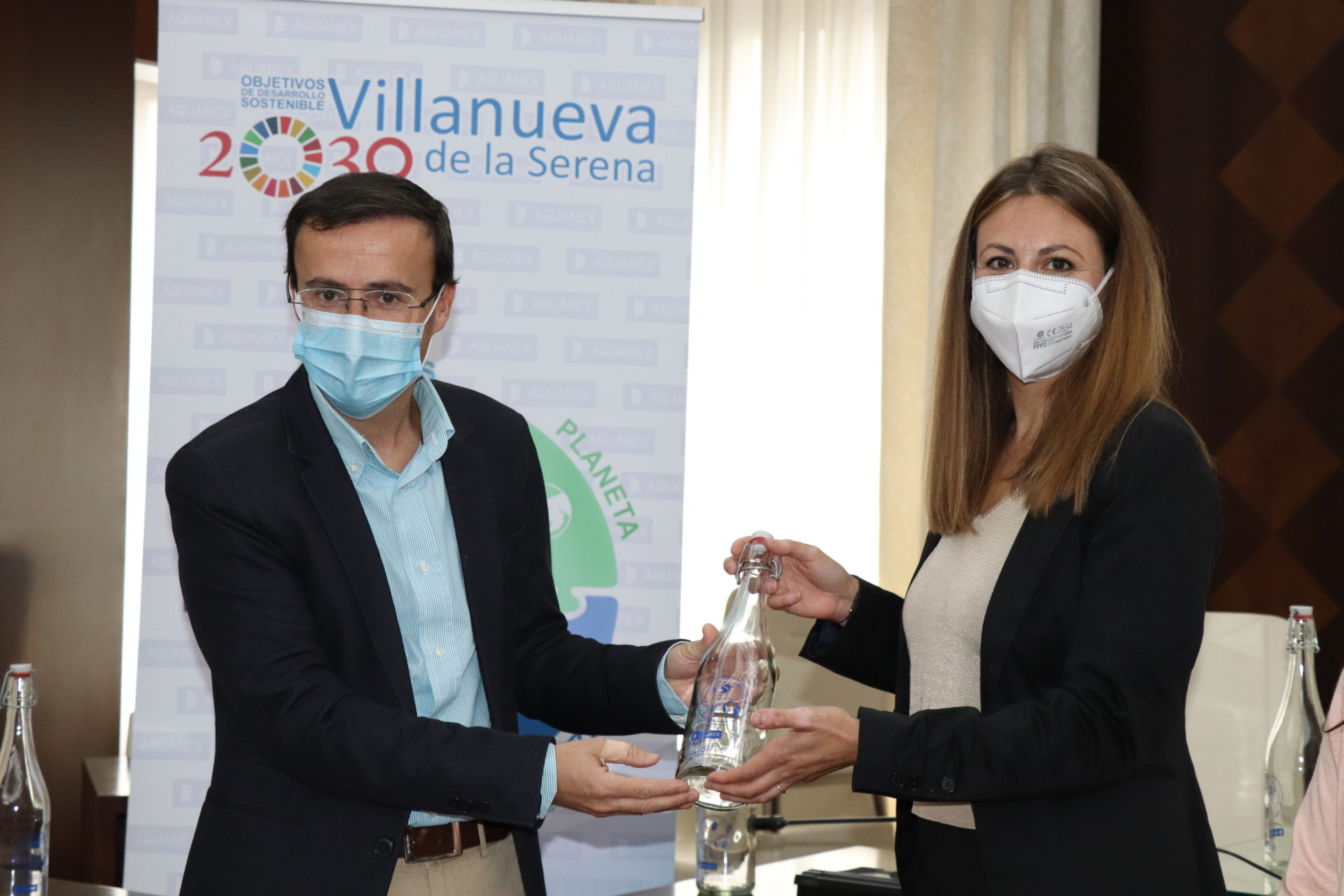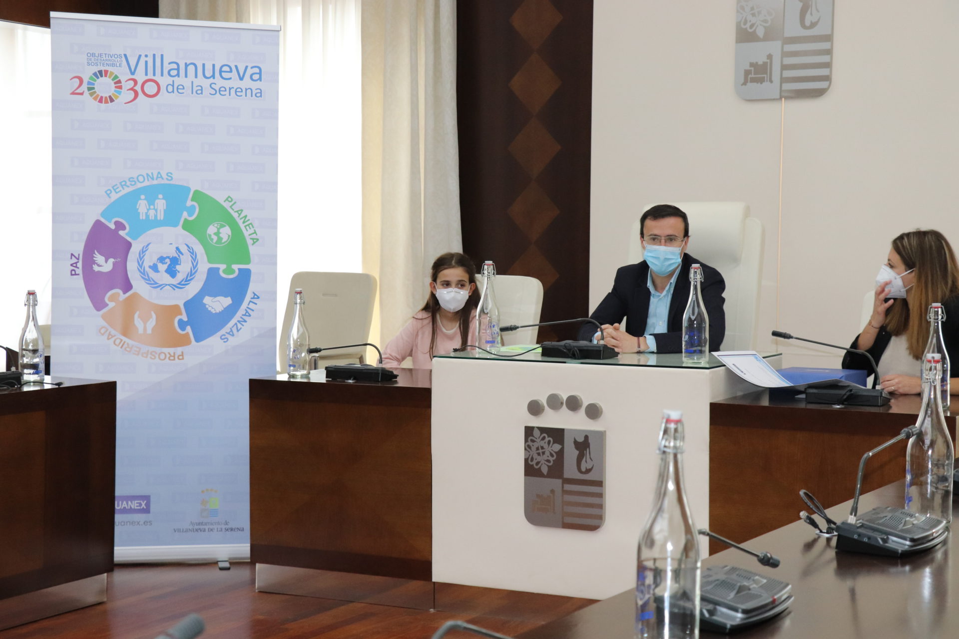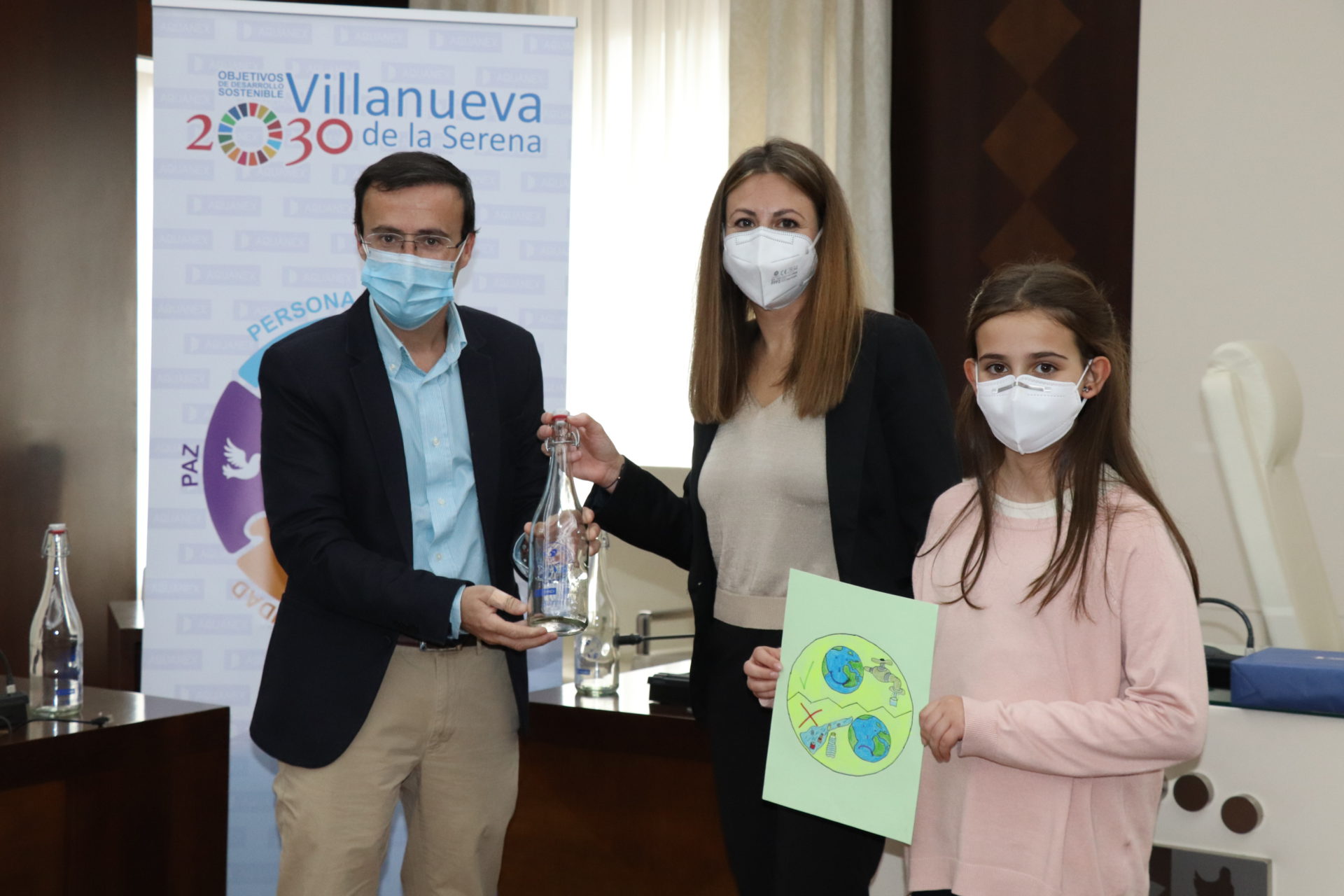 Este miércoles 21, Marta Calderón ha recibido de manos del alcalde Miguel Ángel Gallardo, y de la gerente de concesiones de Badajoz Aquanex, Marta Nieto Carrero, el premio que consta de un diploma y una Tablet. El dibujo ganador del concurso, en el que han participado un total de 179 escolares de 9 a 12 años, de 4º a 6º de Primaria, de los colegios San José, Santiago Apóstol, El Cristo, Cruz del Río, Miguel de Cervantes y Conquistadores; se ha convertido en el logo utilizado para serigrafiar un total de 1.000 botellas de agua. Se van a repartir de forma gratuita en los centros escolares de nuestra localidad, dentro de una campaña de concienciación del fomento del consumo del agua del grifo y los ODS (objetivos de desarrollo sostenible). En esta campaña se hará referencia no solo a la importancia del ahorro y el cuidado del agua, sino también a la importancia de la utilización de botellas reutilizables, en este caso de vidrio, en sustitución de botellas de plástico de un solo uso; fomentando así un consumo responsable y una reducción de los residuos generados como consecuencia del consumo de agua embotellada.