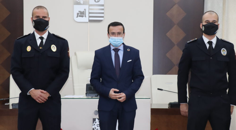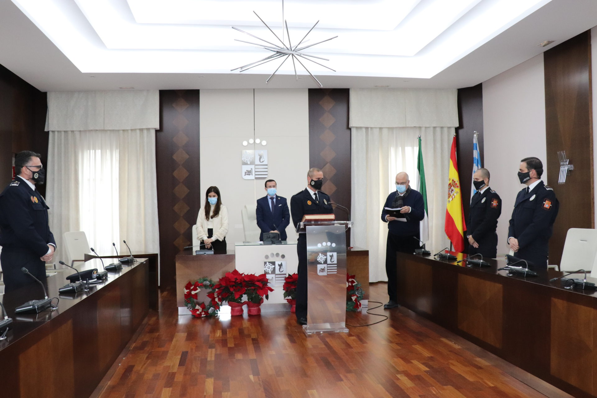 Los agentes de Policía Local Ismael Pérez Casado y Alfonso Corbacho Frutos, que llevan 18 y 5 años respectivamente en el Cuerpo, han prometido este viernes 4 su cargo como oficiales de Policía, tras haber superado el proceso formativo.