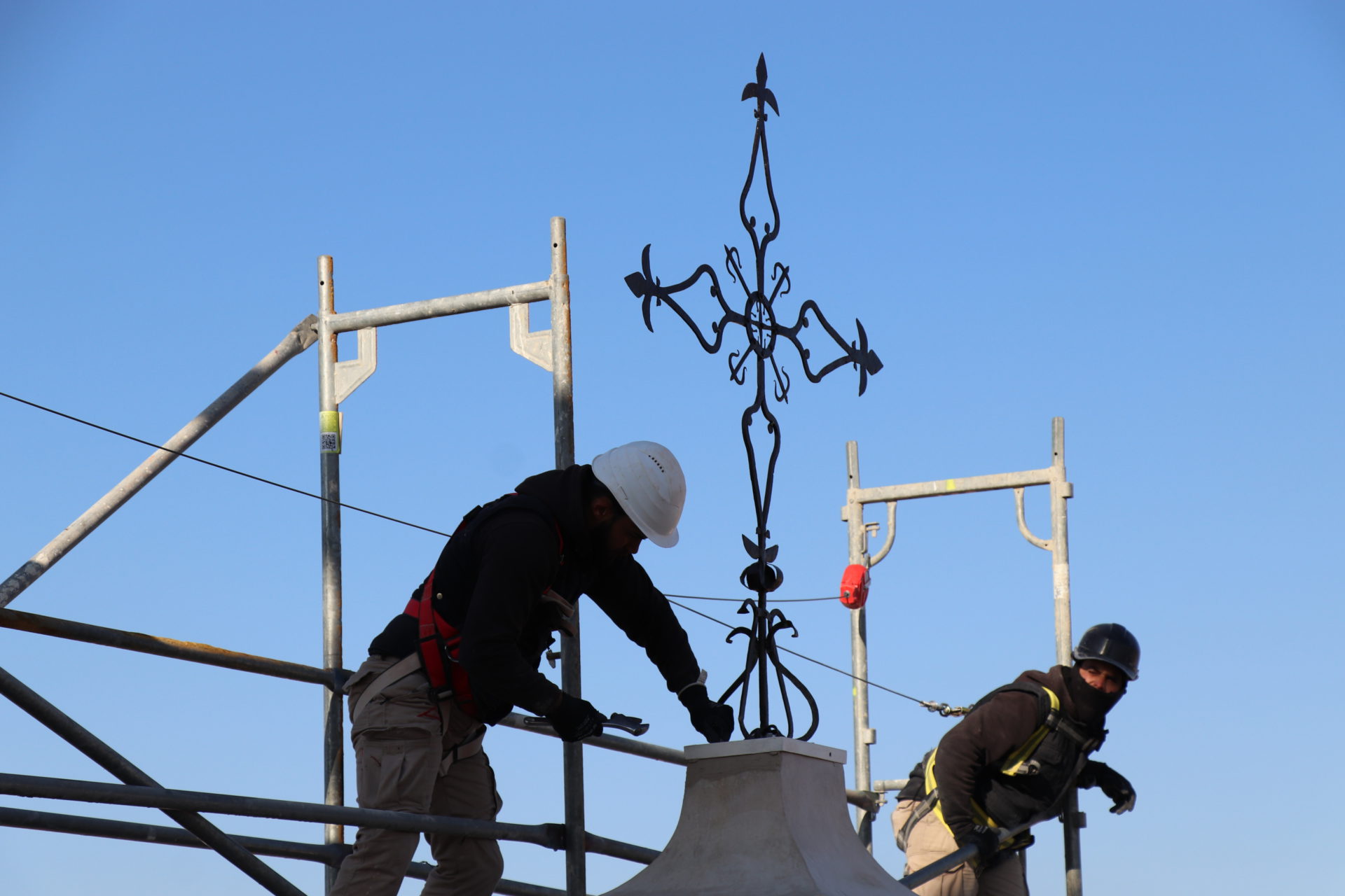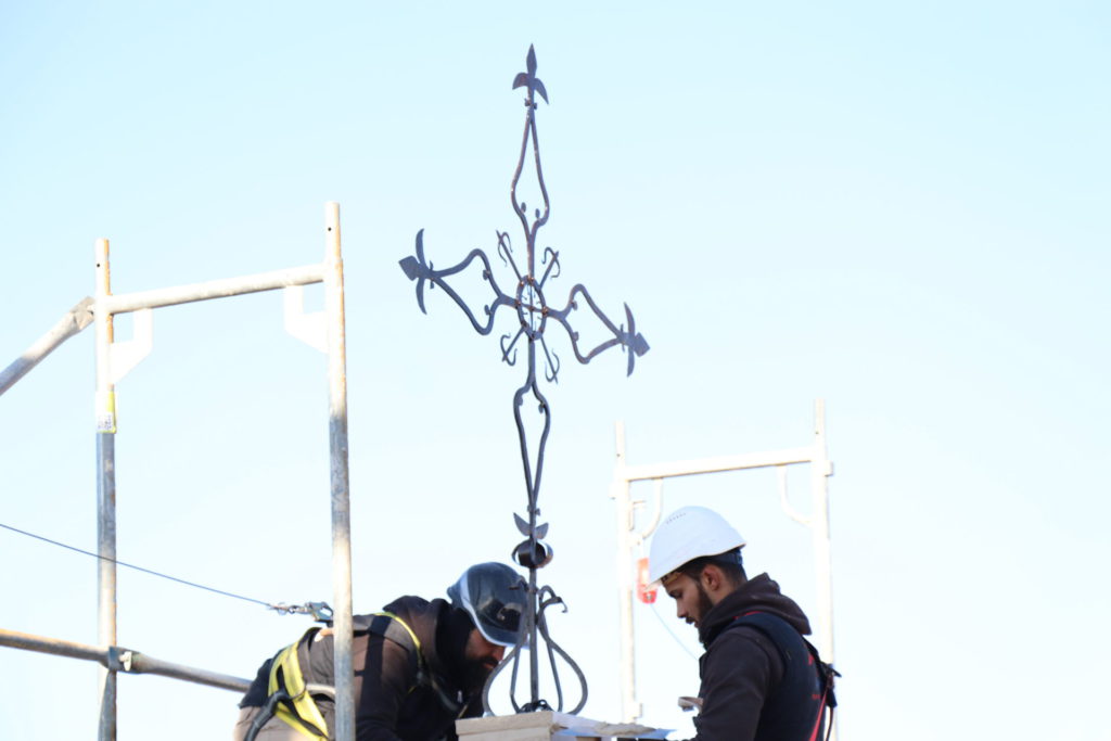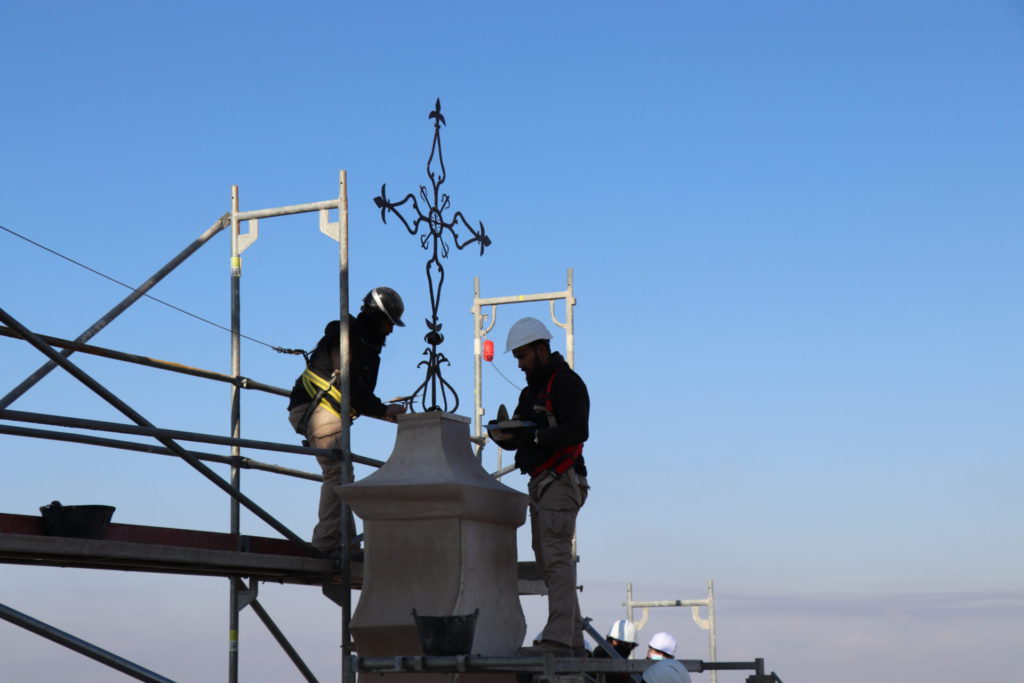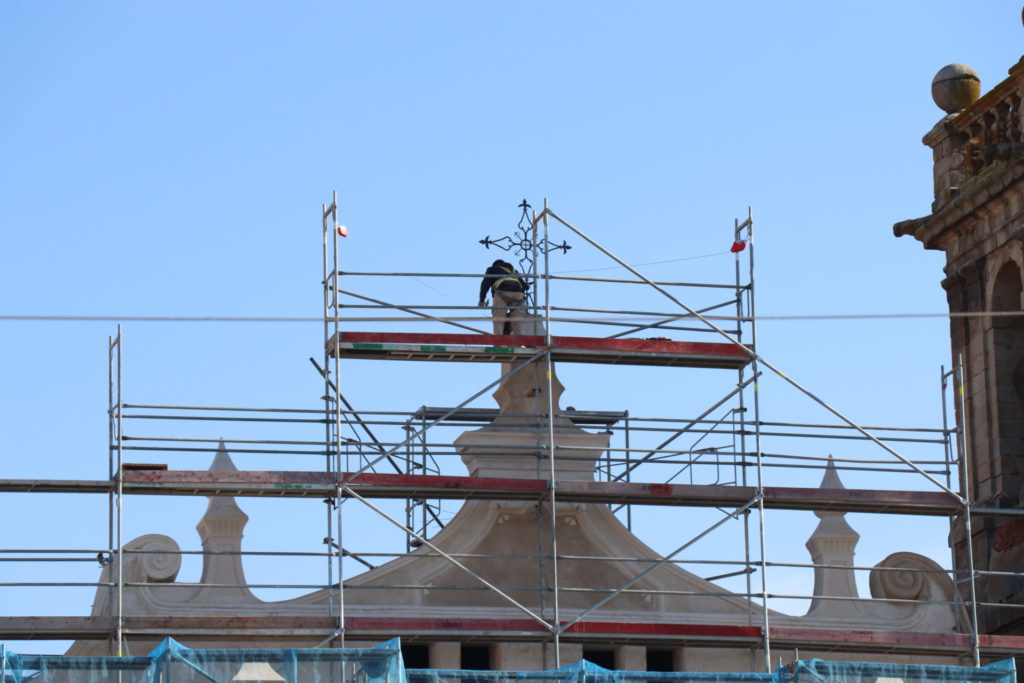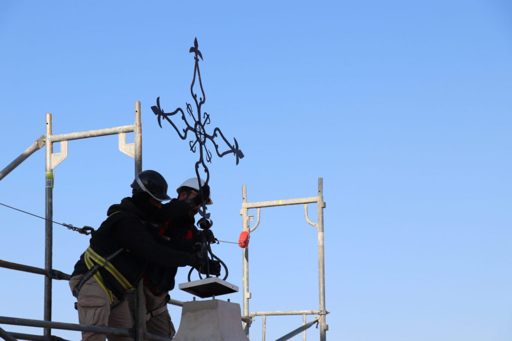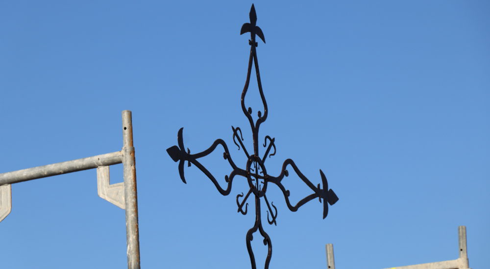 Esta misma mañana, se ha ubicado la Cruz de hierro que se ubica en la parte alta de la iglesia. Se trata de la cruz original que se elaboró a principios del siglo XVII y que se encuentra cincelada en metal y remachada en todas sus piezas. Presenta una geometría de trazos sencillos a base de volutas, todas ellas remachadas, insertándose en el crucero de la misma una cartela a modo de orla donde se encuentra una cruz de la Orden de Alcántara. El trabajo de restauración se ha centrado en la reproducción y recuperación de detalles perdidos, así como en el sistema de anclaje, el cual se ha visto modificado para evitar tensiones a la propia espadaña. Además, se han reforzado todas las uniones de cada una de las piezas que la conforman y se ha respetado su color original, aplicándola un consolidante y fijador que ha evitado alterar su tonalidad y acabado.