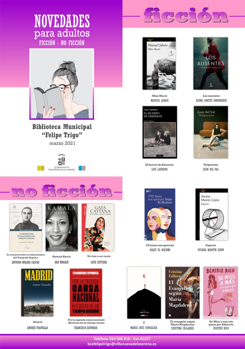 Con respecto a las novedades para adultos, en este mes de marzo se podrán encontrar “Miss Marte” de Manuel Jabois, “Los ausentes” de Juana Cortés Amunarriz, “El huerto de Emerson” de Luis Landero, “Delparaíso” de Juan del Val, “El lunes nos querrán” de Najat el Hachmi, “Especie” de Susana Martín Gijón, “C.” de María José Corraliza, “El evangelio según María Magdalena” de Cristina Fallarás, “De miss a más sin pasar por Albacete” de Beatriz Rico, “La insurrección revolucionaria del Sargento Sopena” de Antonio Molina Cascos, “Kamala Harris” de Dan Morain, “No vine a ser carne” de Gata Cattana, “Madrid” de Andrés Trapiello o “Por la sagrada causa nacional: Historias de un tiempo oscuro” de Francisco Espinosa.