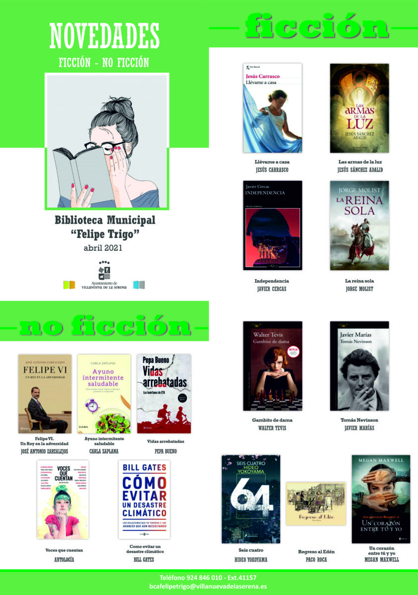 Un mes más, la biblioteca Felipe Trigo continúa con la incorporación de nuevos títulos a su colección, entre los que se encuentran “Lévame a casa” de Jesús Carrasco, “Las armas de la luz” de Jesús Sánchez Adalid, “Independencia” de Javier Cercas, “La reina sola” de Jorge Molist, “Gambito de dama” de Walter Tevis, “Tomás Nevinson” de Javier Marías, “Seis cuatro” de Hideo Yokoyama, “Regreso al Edén” de Paco Roca o “Un corazón entre tú y yo” de Megan Maxwell. Además, “Felipe VI. Un Rey en la adversidad” de José Antonio Zarzalejos, “Ayuno intermitente saludable” Carla Zaplana, “Vidas arrebatadas” de Pepa Bueno, “Voces que cuentan” de Antología y “Como evitar un desastre climático” de Bill Gates.