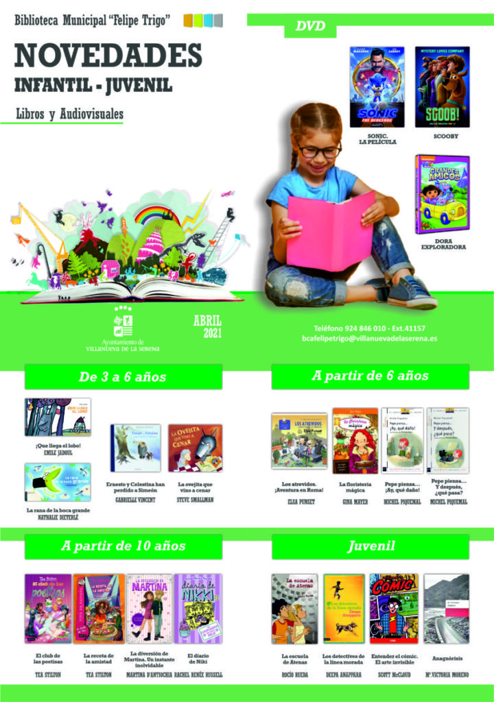 Para el púbico infantil, concretamente de 3 a 6 años “La rana de la boca grande” de Nathalie Dieterlé, “¡Que llega el lobo!” de Emile Jadoul, “Ernesto y Celestina han perdido a Simeón” de Gabrielle Vincent y “La ovejita que vino a cenar” de Steve Smallman. A partir de 6 años, “Los atrevidos. ¡Aventura en Roma!” de Elsa Punset, “La floristería mágica” de Gina Mayer, “Pepe piensa… ¡Ay, qué daño!” o “Y después, ¿qué pasa? de Michel Piquemall. A partir de 10 años, “El club de las poetisas” de Tea Stilton, “La receta de la amistad” de Tea Stilton, “La diversión de Martina. Un instante inolvidable” de Martina D`Antiochia o “El diario de Niki” de Renée Russell.
