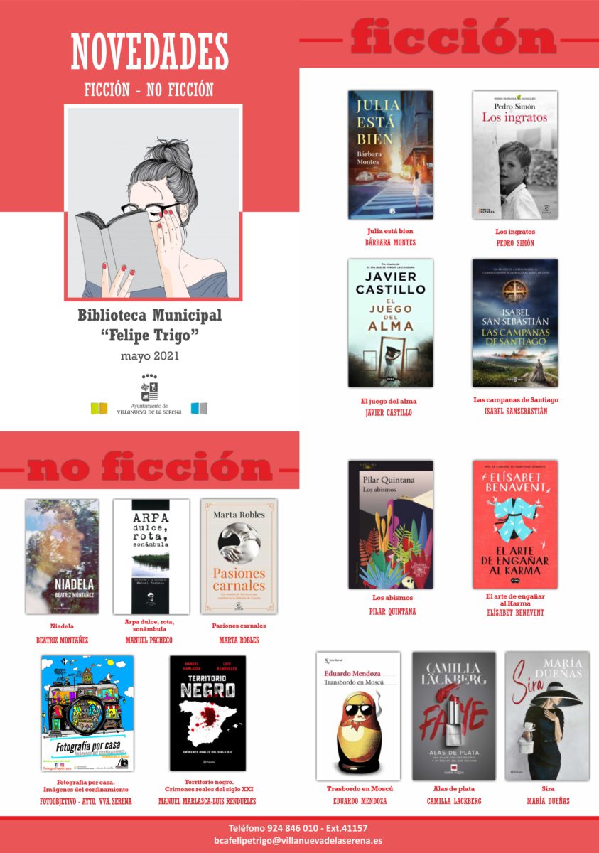Se incorporan nuevos títulos destinados tanto al público infantil, como juvenil y adulto, en la biblioteca Felipe Trigo. En ficción podremos encontrar títulos como “Julia está bien” de Bárbara Montes, “Los ingratos” de Pedro Simón, “El juego del alma” de Javier Castillo, “Las campanas de Santiago” de Isabel Sansebastián, “Los abismos” de Pilar Quintana, “El arte de engañar al Karma” de Elísabet Benavent, “Trasbordo en Moscú” de Eduardo Mendoza, “Alas de plata” de Camilla Lackberg o “Sira” de María Dueñas. En cuanto a las novedades de no ficción podremos encontrar “Niadela” de Beatriz Montañez, “Arpa dulce, rota, sonámbula” de Manuel Pacheco, “Pasiones carnales” de Marta Robles, “Fotografías por casa. Imágenes del confinamiento” de FotObjetivo y el Ayuntamiento de Villanueva de la Serena, así como “Territorio negro. Crímenes reales del siglo XXI” de “Manuel Marlasca-Luis Rendueles.