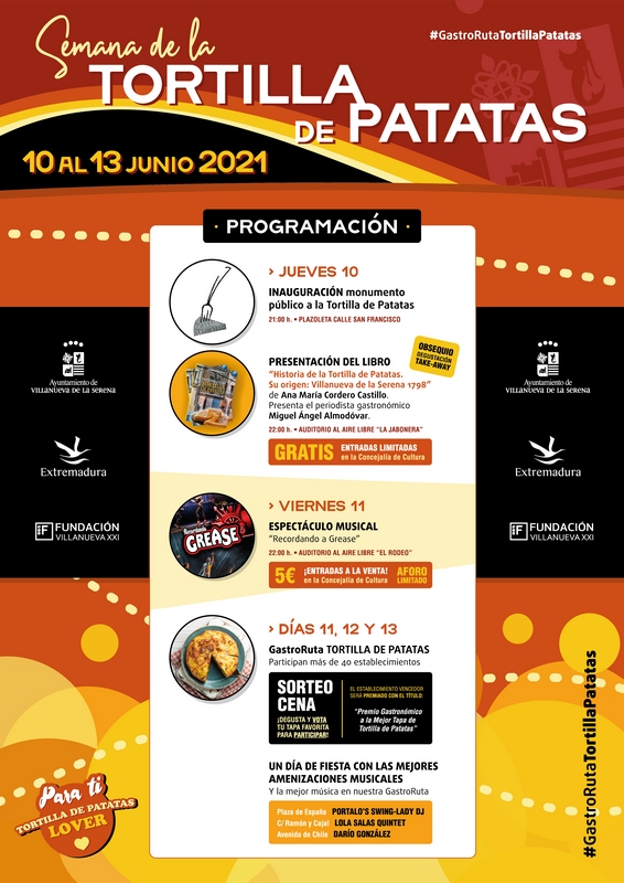 Por otro lado, y como actividades complementarias, el día 10, se llevará a cabo la inauguración del monumento de la tortilla de patatas a las 21:00 horas. Una escultura realizada por el escultor villanovense Antonio Ramos, que se ubicará en la calle San Francisco esquina con la calle Conventual. Una hora después, Ana María Cordero presentará su libro “La historia de la tortilla de patatas. Su origen: Villanueva de la Serena 1798”. Será en el Palacio Consistorial La Jabonera y estará coordinada por el periodista gastronómico Miguel Ángel Almodóvar. La entrada será preasignada y se podrán retirar a partir de mañana miércoles 2 de junio en la concejalía de Cultura. A aquellas personas que asistan, se les obsequiará con un pack degustación take-away.
