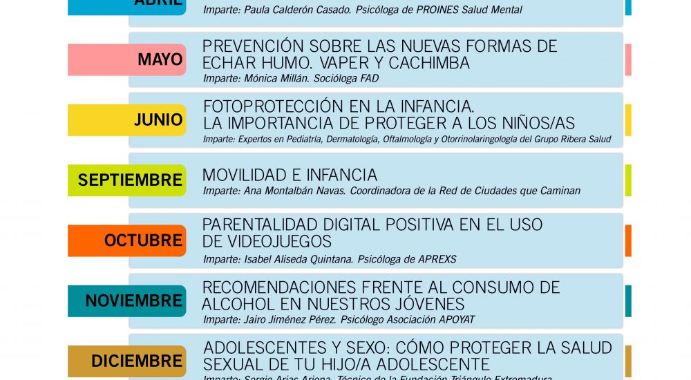 Ana Montalbán, coordinadora de la Red de Ciudades que Caminan, impartirá en septiembre una charla, “Movilidad e Infancia” el próximo mes de septiembre. En octubre, Isabel Aliseda, volverá a impartir otra charla sobre “Parentalidad digital positiva en el uso de videojuegos”. El penúltimo mes del año, Jairo Jiménez, psicólogo de APOYAT impartirá recomendaciones frente al consumo de alcohol en nuestros jóvenes.