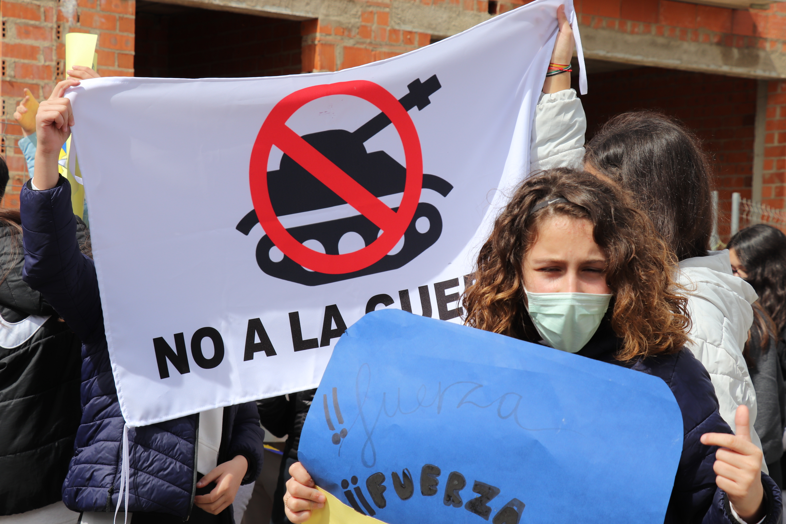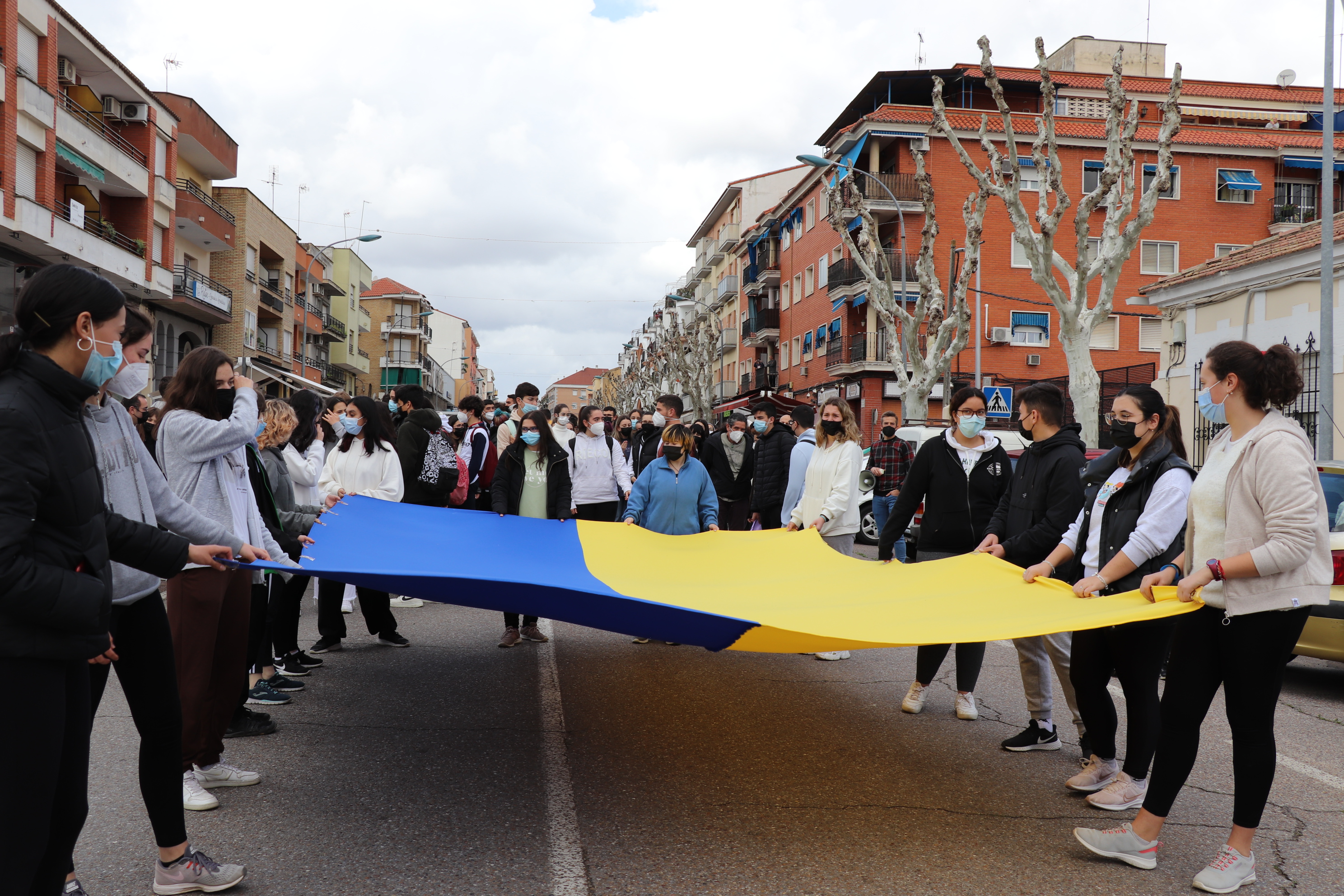 Los 500 alumnos han elaborado las propias pancartas y han portado entre varios, la bandera de Ucrania, desde la puerta de su centro hasta el palacio de congresos.