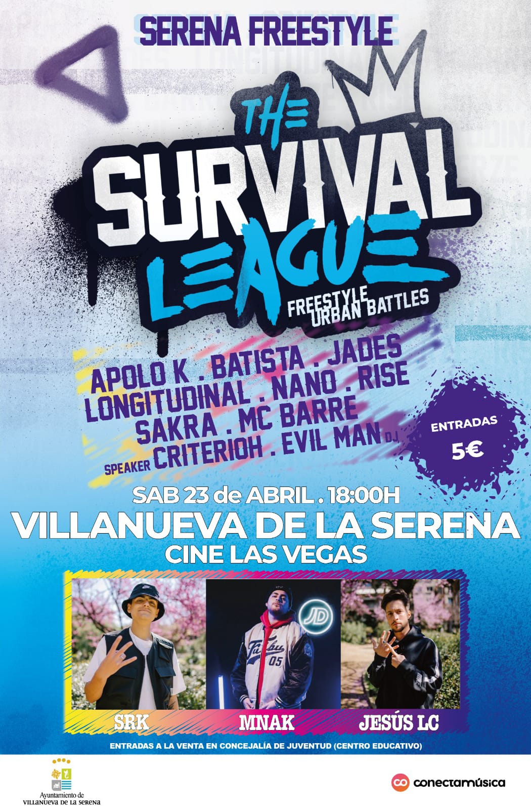 Dentro de esta iniciativa, se celebrará la tercera jornada de “The survival league”, que acogerá a los 8 freestylers más importantes de la región acompañados de un dj y un speaker, que ofrecerá más de dos horas de auténtico combate dialéctico y la mejor música de hip-hop. Con participantes muy conocidos no solo en el ámbito regional sino también nacional, tales como Apolo K, Batista, Jades, Longitudinal, Nano, Rise, Sakra y MC Barre.