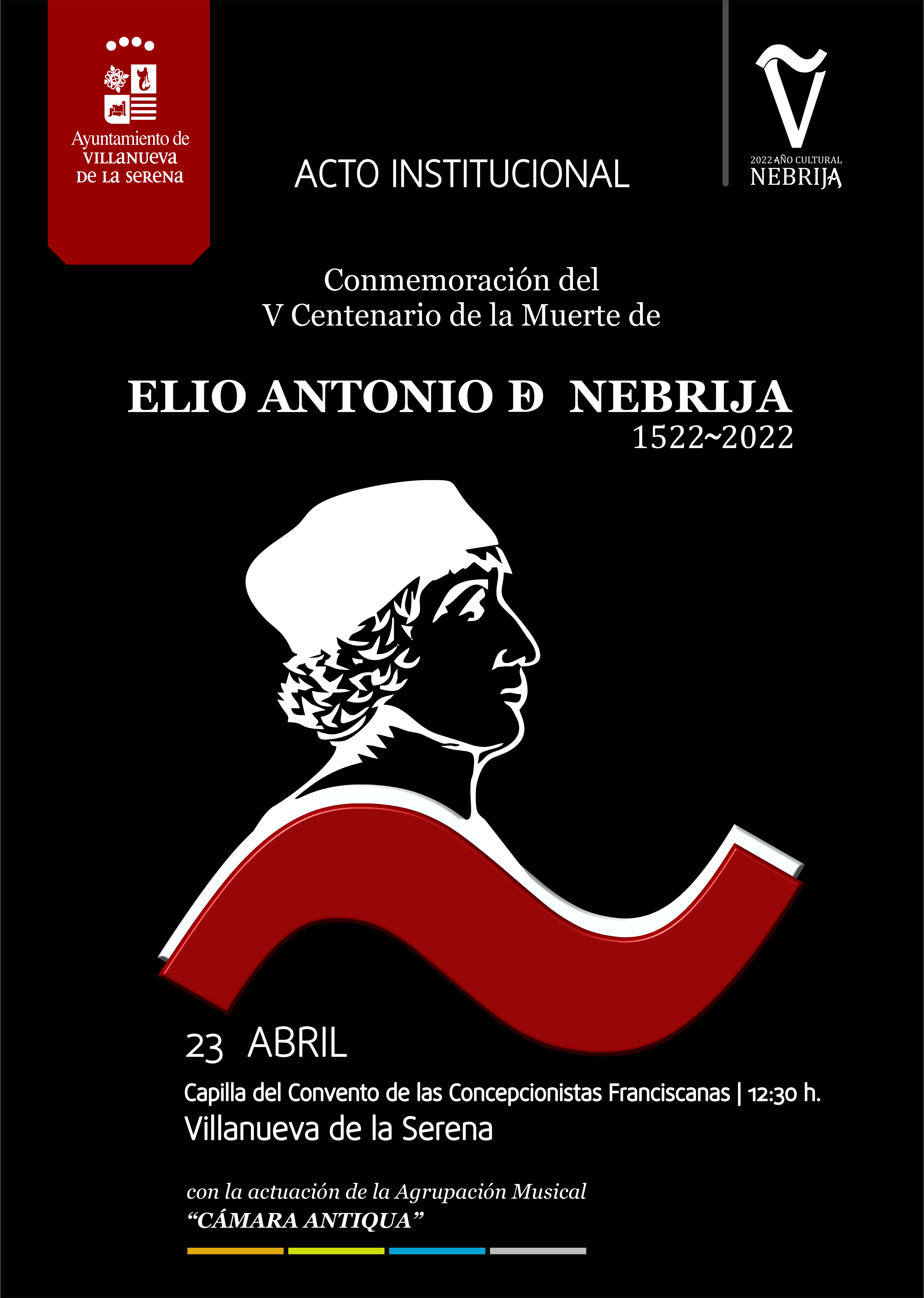 Este sábado, 23 de abril, comienza el programa de actividades organizadas con motivo de la conmemoración del V Centenario del fallecimiento de Antonio de Nebrija, padre de la primera gramática española. Una efeméride a la que se suma Villanueva de la Serena, ya que forma parte de las trece poblaciones que integran la llamada ruta Nebrisense; poblaciones en las que Antonio de Nebrija estuvo, desde Lebrija, donde nació, hasta Alcalá de Henares donde falleció.