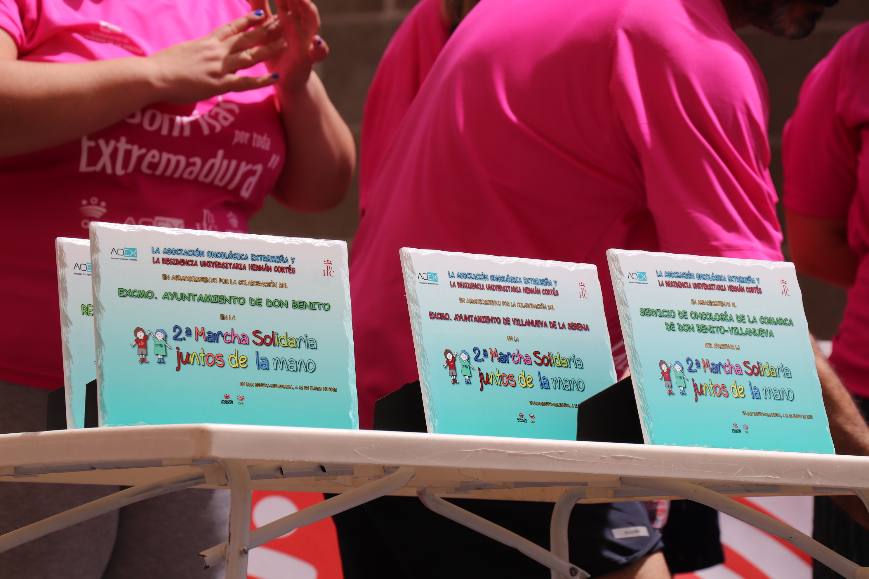 Una marcha que comenzó en Don Benito a las 10:30 horas y tras recorrer siete kilómetros, finalizó en la plaza de España de Villanueva de la Serena dando paso a diferentes actividades como música, photocall, presentación de la canción y fotos con la mascota “Vonco”, además de la entrega de zumo, agua o fruta para todos los participantes.