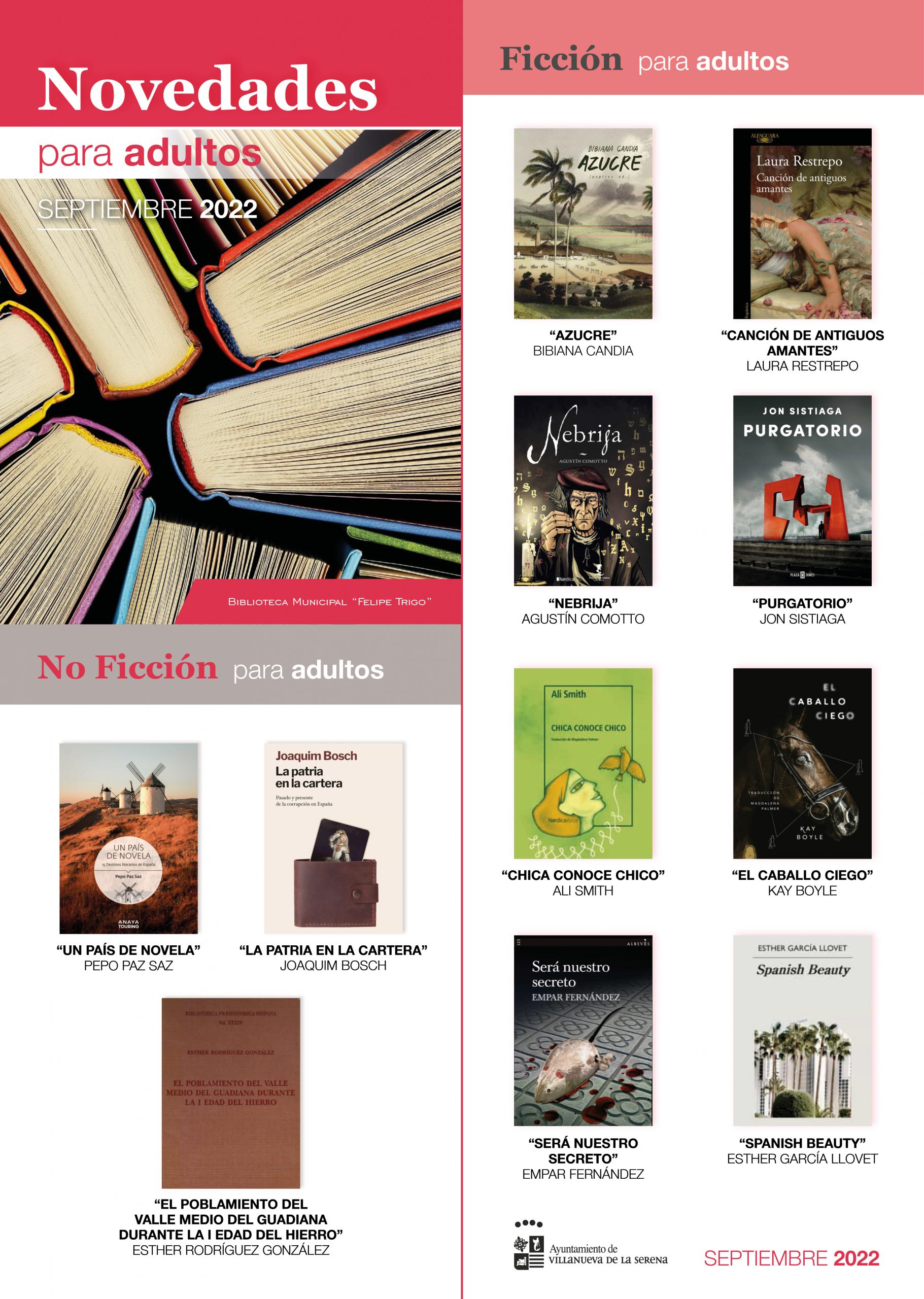 Con respecto a las novedades para adultos se pueden encontrar nuevos títulos como “Un país de novela” de Pepo Paz, “La patria en la cartera” de Joaquim Bosch, “El poblamiento del valle medio del Guadiana duranta la I Edad del Hierro” de Esther Rodríguez González, “Azucre” de Bibiana Candia, “Canción de antiguos amantes” de Laura Restrepo, “Nebrija” de Agustín Comotto, “Purgatorio” de Jon Sistiaga, “Chica conoce chico” de Ali Smith, “El caballo ciego” de Kay Boyle, “Será nuestro secreto” de Empar Fernández y “Spanish beauty” de Esther García.