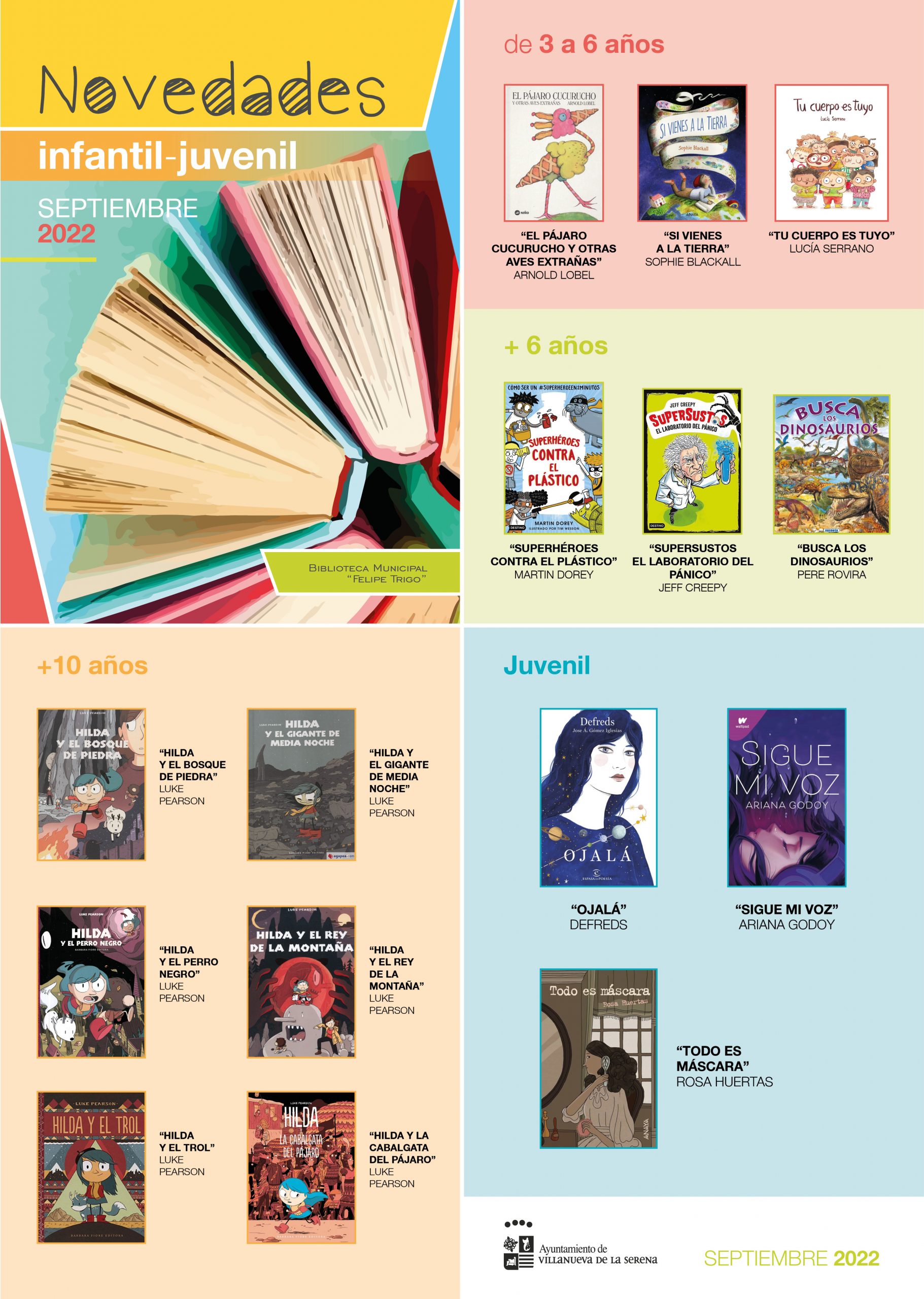 Por último, el público infantil y juvenil tendrá también nuevos títulos para leer. Entre ellos se encuentran, “El pájaro cucurucho y otras aves extrañas” de Arnold Lobel, “Si vienes a la tierra” de Sophie Blackall, “Tu cuerpo es tuyo” de Lucía Serrano, “Superhéroes contra el plástico” de Martín Dorey, “Supersustos el laboratorio del pánico” de Jeff Creepy, “Busca los dinosaurios” de Pere Rovira, “Hilda y el bosque de piedra” , “Hilda y el gigante de media noche”, “Hilda y el perro negro”, “Hilda y el rey de la montaña”, “Hilda y el trol”, “Hilda y la cabalgata del pájaro”, todas ellas de Luke Pearson.