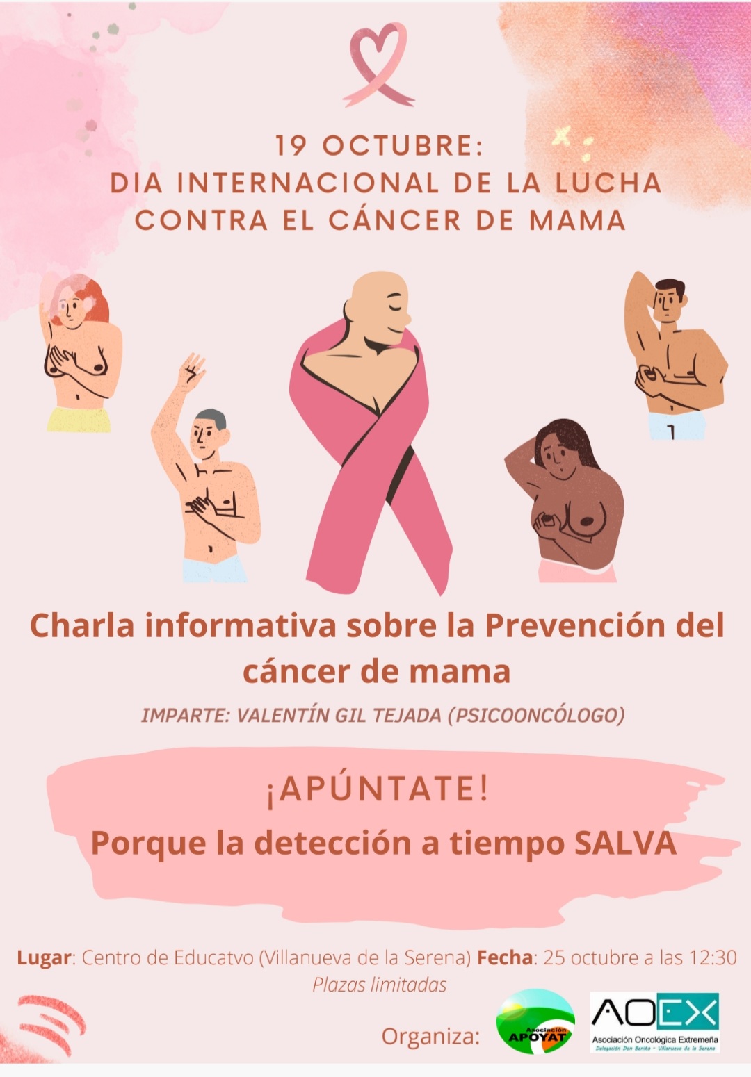Otra de las actividades que se desarrollan en Villanueva de la Serena, destaca la que se desarrollará en el centro educativo Jesús García Trujillo, el día 25 a las 12:30 horas. Se trata de una charla informativa sobre la prevención del cáncer de mama impartida por el psico oncólogo de AOEx, Valentín Gil.
