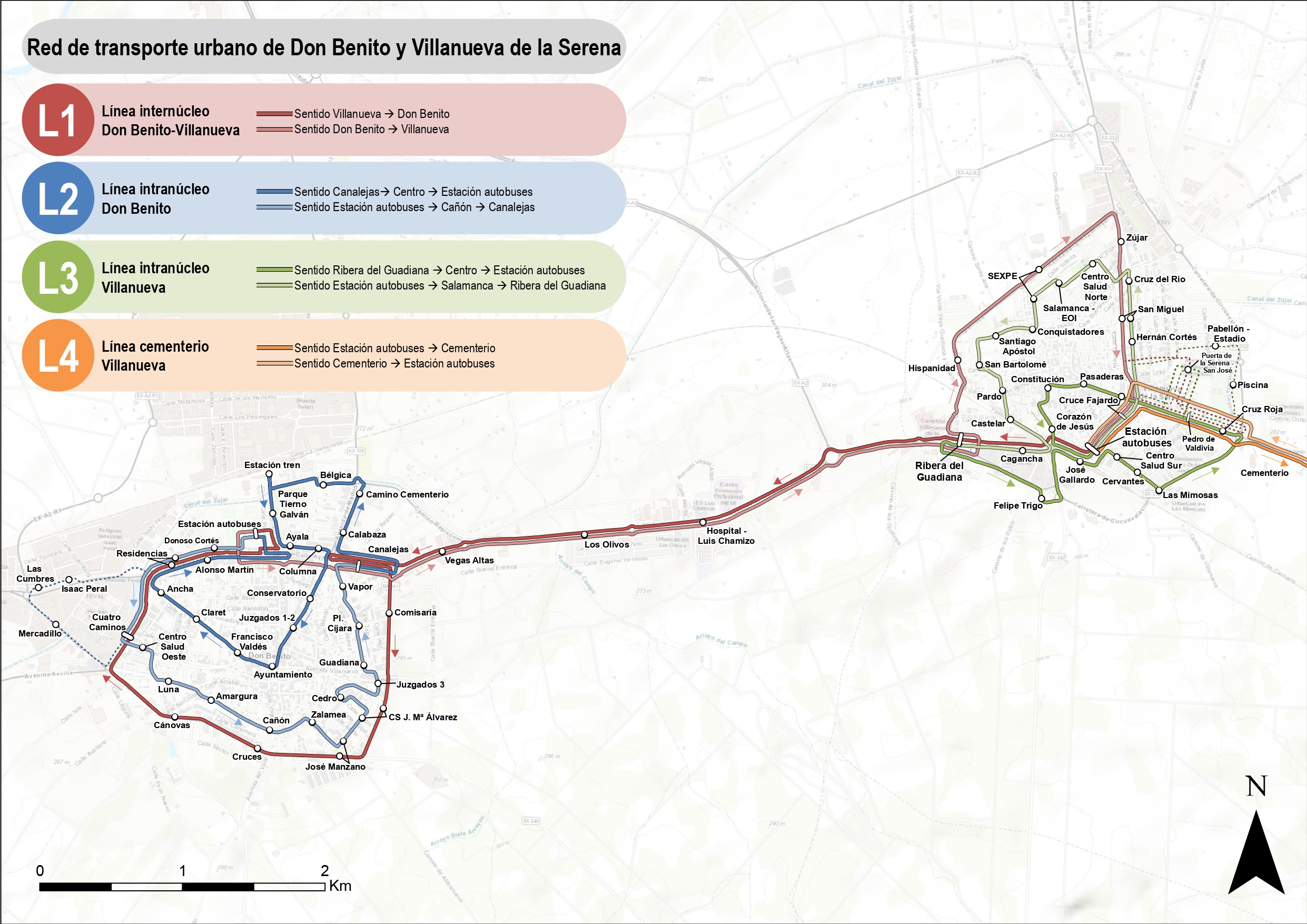 La primera, será la línea internúcleo Don Benito-Villanueva cuyo recorrido será desde la estación de autobuses de Villanueva de la Serena hacia la estación de autobuses de Don Benito y viceversa. La línea dos, será una línea intranúcleo en Don Benito con sentido Canalejas, centro de la ciudad, estación de autobuses y viceversa. La tercera línea será la línea intranúcleo en Villanueva de la Serena cuyo recorrido será sentido Ribera del Guadiana, centro de la ciudad y estación de autobuses y viceversa y la línea cuatro es la línea para el cementerio de Villanueva de la Serena con sentido estación autobuses a cementerio y viceversa.