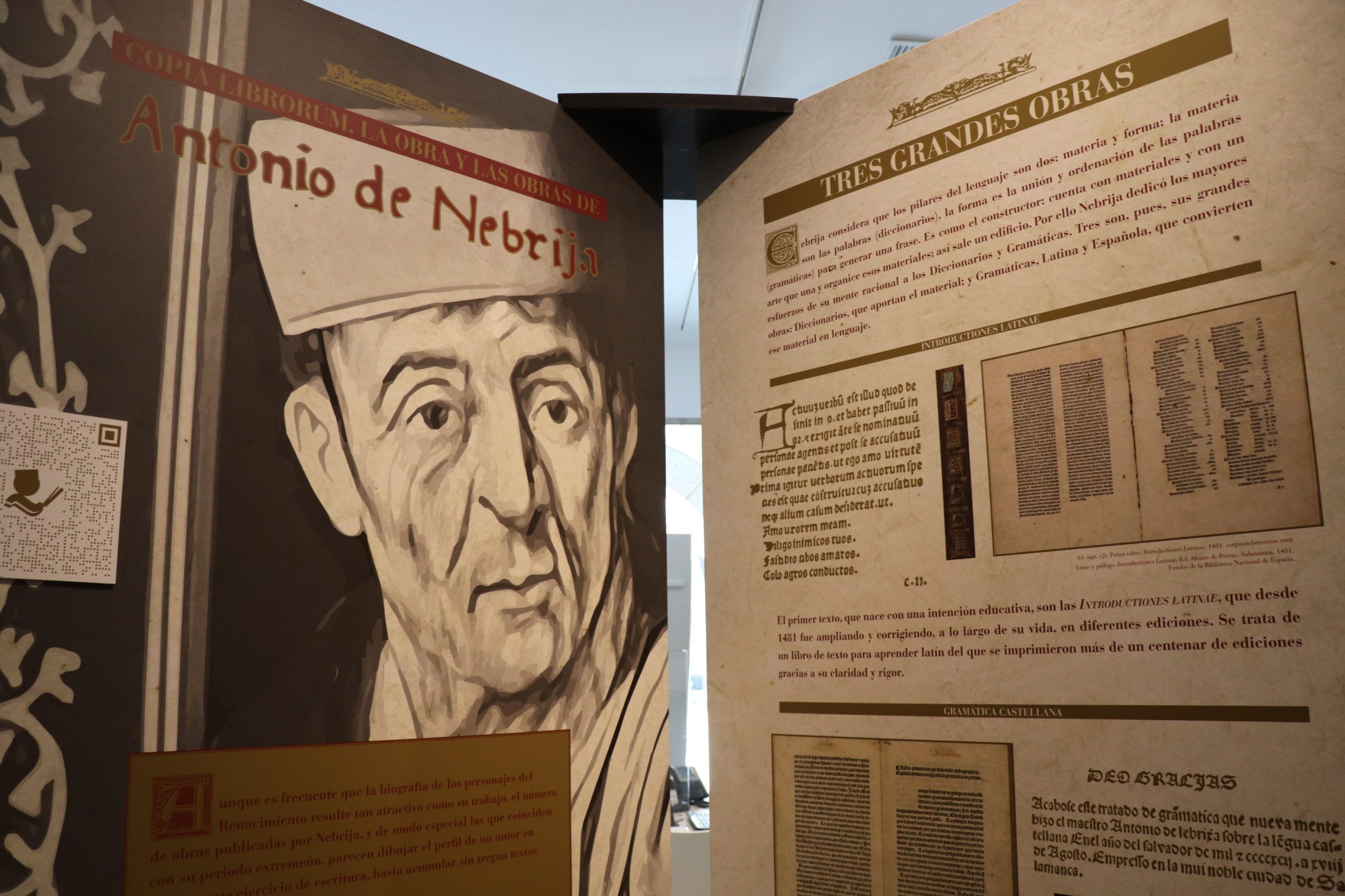 Con esta esta exposición, se pretende acercar la figura de Nebrija a la ciudadanía y se hace a partir de paneles, audiovisuales, documentación, reproducciones y piezas artísticas creadas para la ocasión. Todo ello de la mano del catedrático de la Uex, Eustaquio Sánchez Salor, como comisario académico; y el diseñador gráfico Javier Remedios, como comisario artístico. A través de la combinación de textos, objetos, efectos sonoros, luces, o de la recreación de la famosa viñeta de la Corte de Juan de Zúñiga a tamaño real, como photocall de la exposición, se atiende a una idea esencial: los años extremeños resultan de singular fecundidad para Antonio de Nebrija.