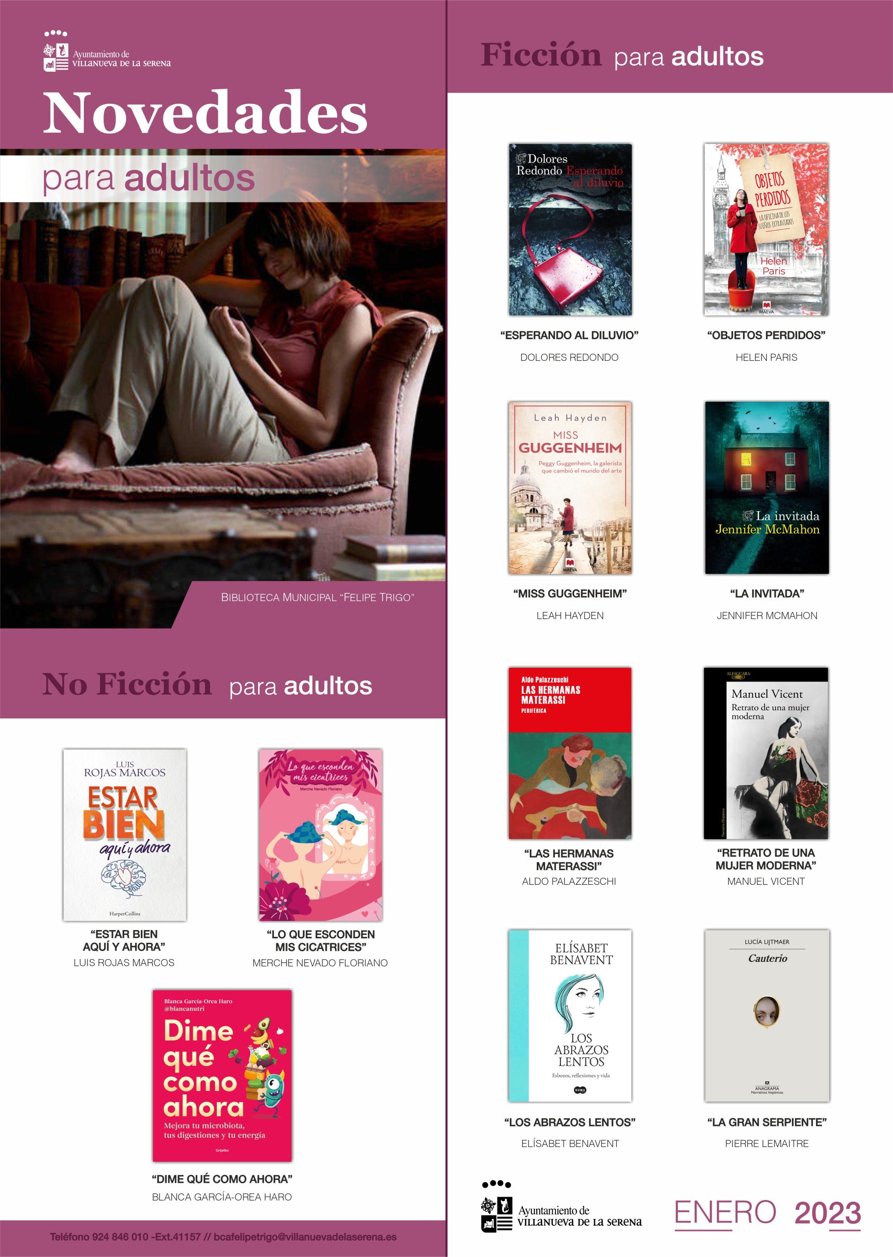 Con respecto a las novedades para adultos, el año comienza con diversos nuevos títulos. Entre ellos, “Esperando al diluvio” de Dolores Redondo, “Objetos perdidos” de Helen París, “Miss Guggenheim” de Leah Hayden, “La invitada” de Jennifer Mcmahon, “Las hermanas Materassi” de Aldo Palazzeschi, “Retrato de una mujer moderna” de Manuel Vicent, “Los abrazos lentos” de Elísabet Benavent, “La gran serpiente” de Pierre Lemaitre, “Estar bien aquí y ahora” de Luis Rojas Marcos, “Lo que esconden mis cicatrices” de Merche Nevado Floriano y “Dime qué como ahora” de Blanca García-Orea Haro.