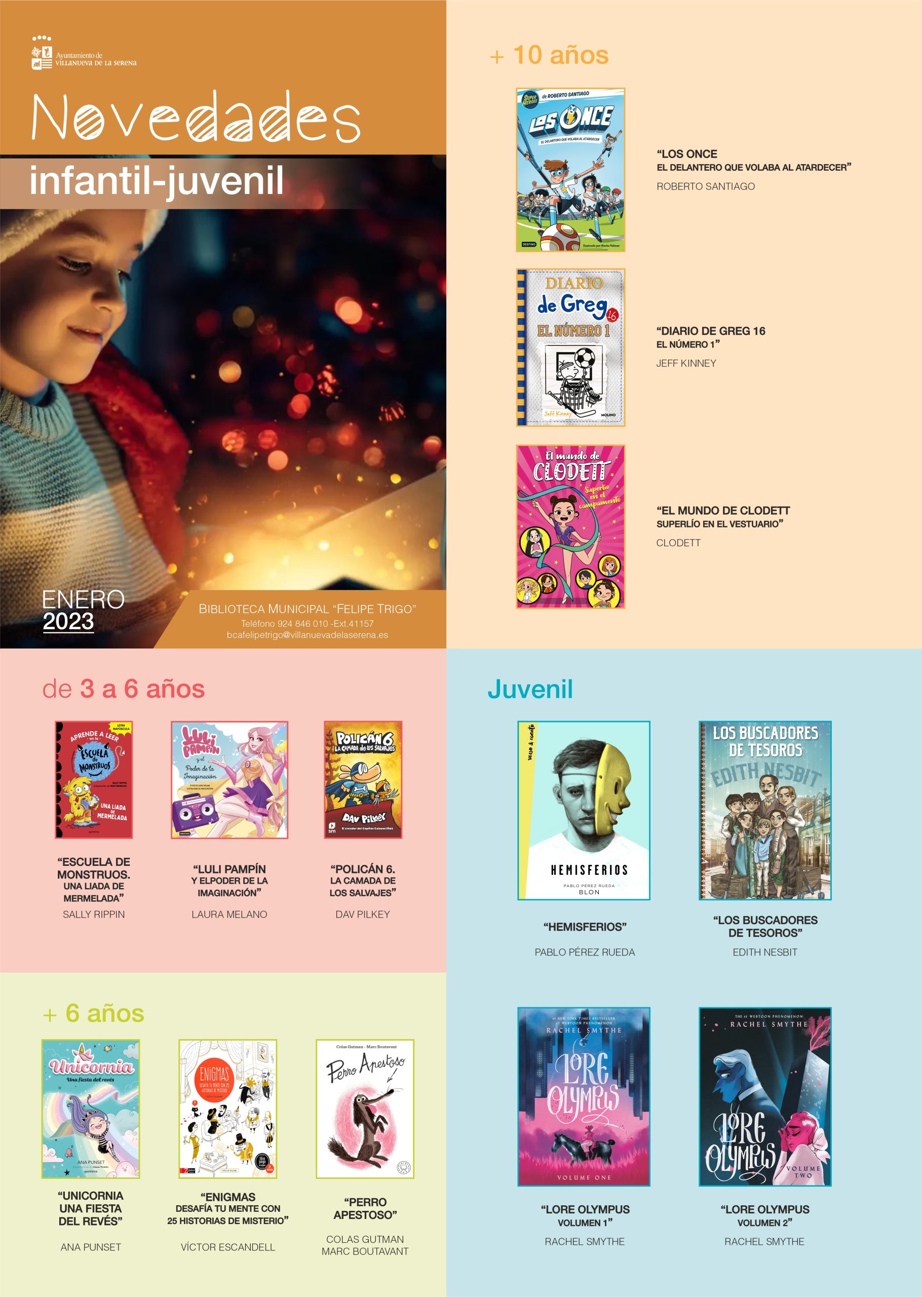 Para el público infantil, “Los once. El delantero que volaba al atardecer” de Roberto Santiago, “Diario de Greg 16. El número 1” de Jeff Kinney, “El mundo de Clodett. Super lío en el vestuario” de Clodett. “Escuela de monstruos. Una liada de mermelada” de Sally Rippin, “Luli Pampín y el poder de la imaginación” de Laura Melano, “Policán 6. La camada de los salvajes” de Dav Pilkey, “Hemisferios” de Pablo Pérez Rueda, “Los buscadores de tesoros” de Edith Nesbit, “Unicornia una fiesta del revés” de Ana Punset, “Enigmas desafía tu mente con 25 historias de misterio” de Víctor Escandell, “Perro apestoso” de Colas Gutman y Marc Boutavant y “Lore Olumpus 1 y 2” de Rachel Smythe.