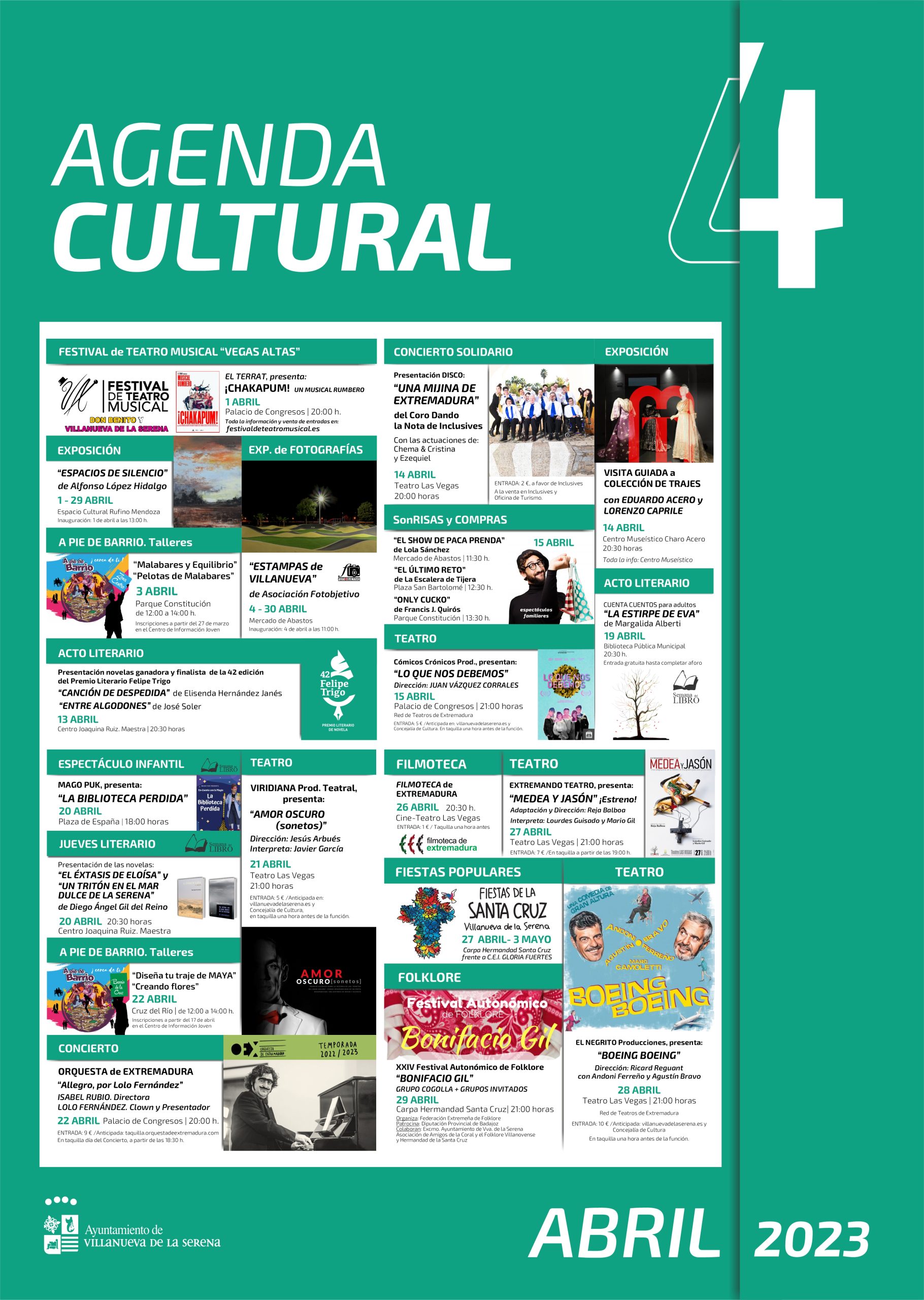 A través de la red de teatros de Extremadura este mes contamos con: La compañía Cómicos Crónicos y su obra “Lo que nos debemos” en el palacio de congresos a las 21 horas el sábado 15. Por otro lado, “Boeing Boeing” de El Negrito Producciones el 28 de abril a las 21h en el Teatro Las Vegas con Agustín Bravo y Andoni Ferreño.