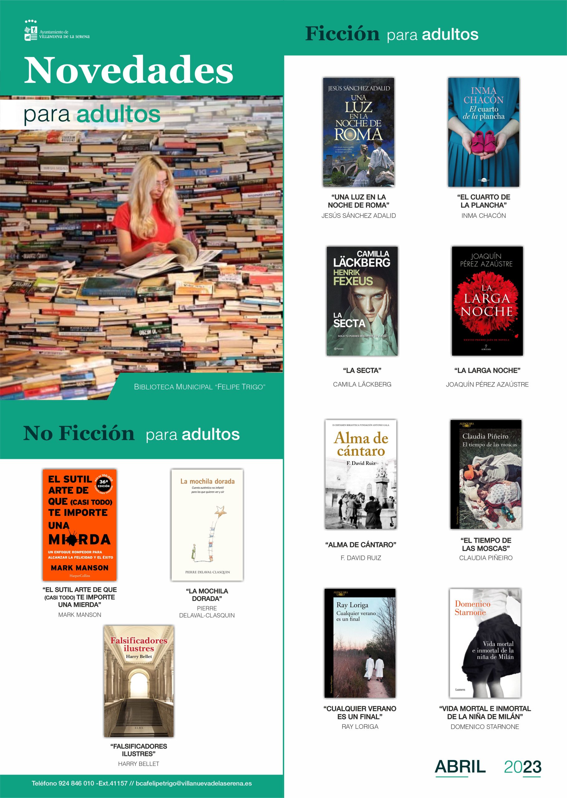 Con respecto a las novedades para adultos, se pueden encontrar títulos como “Una luz en la noche de Roma” Jesús Sánchez Adalid, “El cuarto de la plancha” de Inma Chacón, “La secta” de Camila Läckberg, “La larga noche” de Jojaquín Pérez Azaústre, “Alma de Cántaro” F. David Ruiz, “El tiempo de las moscas” de Claudia Piñeiro, “Cualquier verano es un final” de Ray Loriga, “Vida mortal e inmortal de la niña de Milán” de Domenico Starnone, “El sutil arte de que te importe una mierda” de Mark Manson, “La mochila dorada” de Pierre Delaval-Ckasquin, y “Falsificadores ilustres” de Harry Bellet.