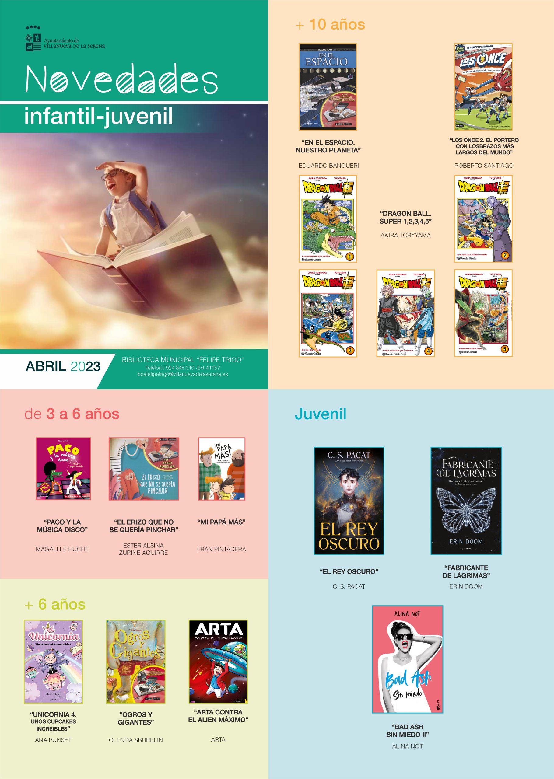 Por último destacar que también hay novedades para el público infantil y juvenil entre loas que se encuentran “Paco y la música disco” de Magali le Huche, “El erizo que no se quería pinchar” de Ester Alsina Zuriñe Aguirre, “Mi papá más” de Fran Pintadera, “Unicornia 4. Unos cupcakes íncreibles” de Ana Punset, “Ogros y gigantes” de Glenda Sburelin, “Arta contra el alien máximo” de Arta, “En el espacio. Nuestro planeta” de Eduardo Banqueri, “Los Once 2. El portero con los brazos más largos del mundo” de Roberto Santiago y Dragon Ball super 1,2,3,4 y 5 de Akira Toryyama. A estos títulos se suman tres títulos juveniles como “El rey oscuro” de C.S. Pacat, “Fabricante de lágrimas” Erin Doom y “Bad ash sin miedo II” de Alina Not.