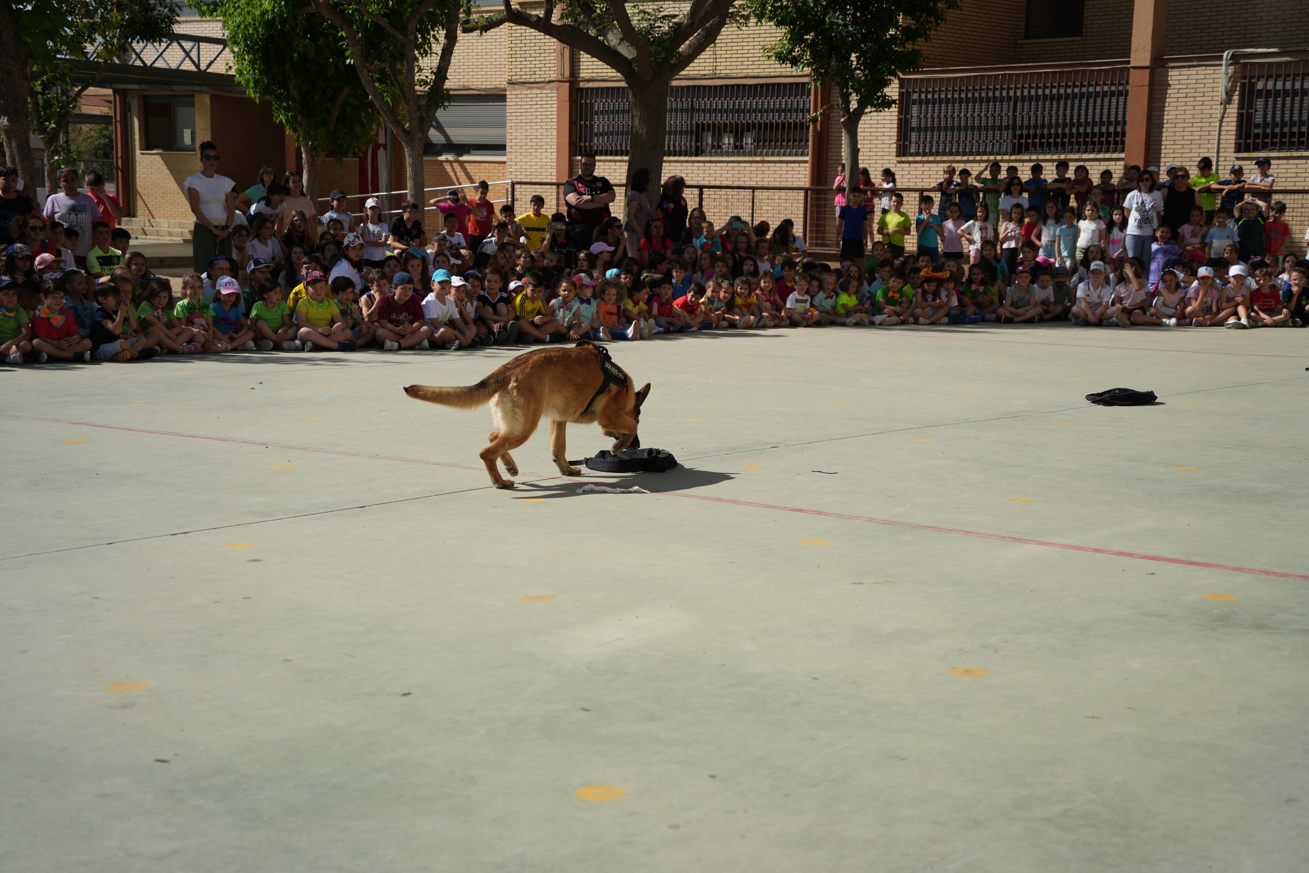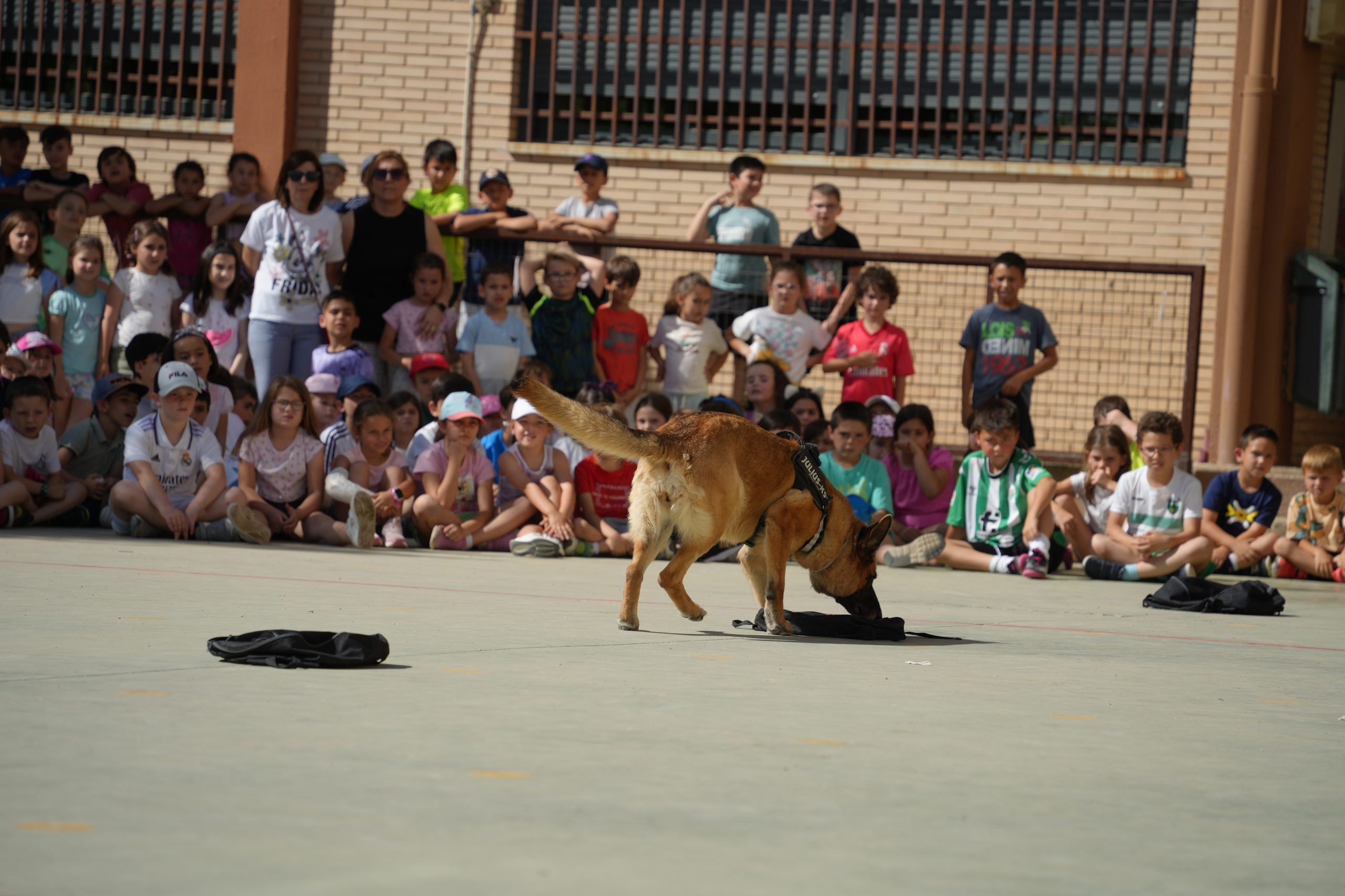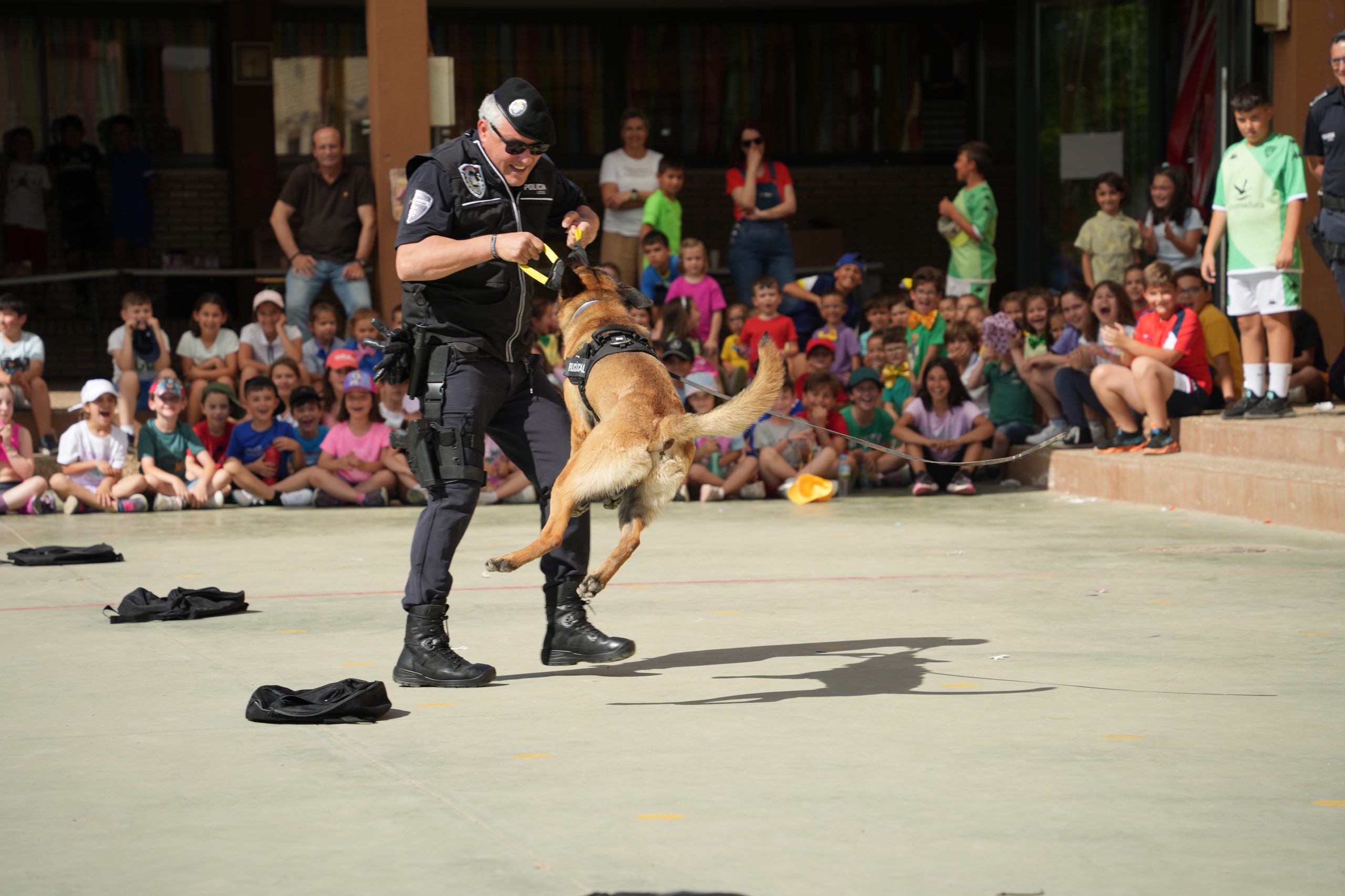 Los alumnos y alumnas del CEIP Miguel de Cervantes, han disfrutado este viernes 28 de abril, de una exhibición de la Unidad Canina de la Policía Local en el patio del centro. Se trata de una actividad enmarcada dentro de la Semana Cultural que celebra el centro desde el pasado lunes. Iniciativa a la que se suman la realización de una acampada, un pasaje del terror o actividades relacionadas con el circo, malabares, talleres… sin dejar atrás un desayuno de churros con chocolate y un partido de fútbol entre alumnos y profesores.