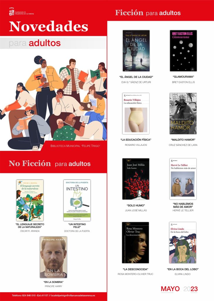 Por lo que respecta a las novedades de adultos, en no ficción hay tres obras disponibles. “El lenguaje secreto de la naturaleza”, de Óscar R Aranda; “Un intestino feliz”, de la doctora De la Puerta; y “En la sombra” del Príncipe Harry. En cuanto a la ficción, son ocho los títulos disponibles. “El ángel de la ciudad”, Eva García Sáenz de Urturi; “Glamourama”, de Bret Eatson Elis; “La educación física”, de Rosario Villajos; “Maldito Hamor”, de Cruz Sánchez de Lara; “Solo humo”, de Juan José Millás; “No hablemos más de amor”, de Hervé Le Tellier; “La desconocida”, de Rosa Montero y Olivier Truc; y “En la boca del lobo”, de Elvira Lindo.