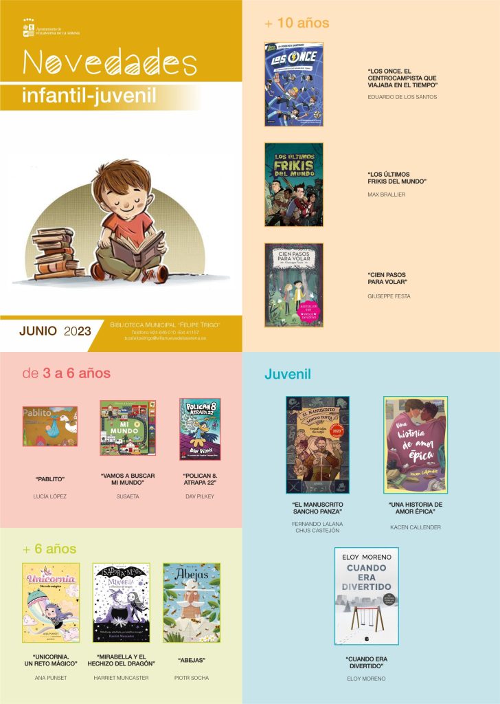 Con respecto a las novedades para el público infantil y juvenil se encuentra, “Pablito” de Lucía López, “Vamos a buscar mi mundo” de Susaeta, “Polican 8. Atrapa 22” de Dav Pilkey, “Unicornia. Un reto mágico” de Ana Punset, “Mirabella y el hechizo del dragón” de Harriet Muncaster, “Abejas” de Pior Socha, “Las once. El centrocampista que viajaba en el tiempo” de Eduardo de los Santos, “Los últimos frikis del mundo” de Max Brallier, “Cien pasos para volar” de Giuseppe Festa, “El manuscrito Sancho Panza” de Fernando Lalana y Chus Castejón, “Una historia de amor épica” de Kacen Callender y “Cuando era divertido” de Eloy Moreno.