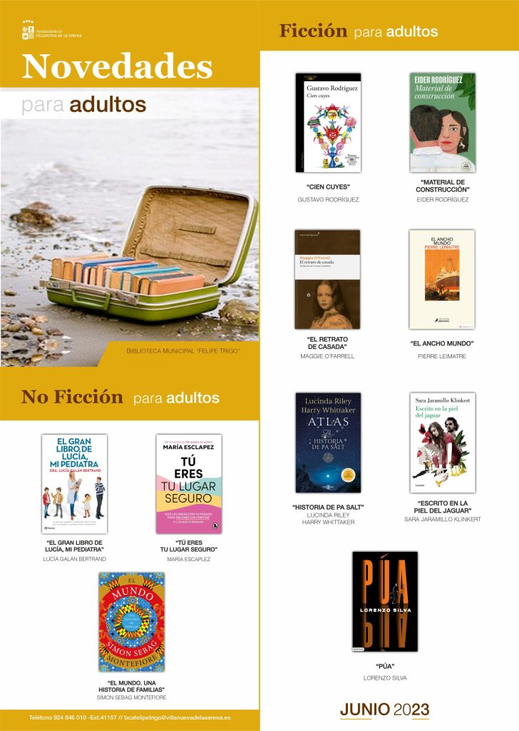 Por último, también se incorporan nuevos títulos tanto de ficción como no ficción para adultos. Se tratan de “El gran libro de Lucía mi pediatra” de Lucía Galán Bertrand, “Tú, eres tu lugar seguro” de María Escaplez, “El mundo. Una historia de familias” de Simón Sebag Montefiore, “Cien cuyes” de Gyustavo Rodríguez, “Material de construcción” Eider Rodríguez, “El retrato de casada” de Maggie o Farrell, “El ancho mundo” de Pierre Leimatre, “Historia de Pa Salt” de Lucinda Riley y Harry Whittaker, “Escrito en la piel del jaguar” de Sara Jaramillo y “Púa” con Lorenzo Silva.