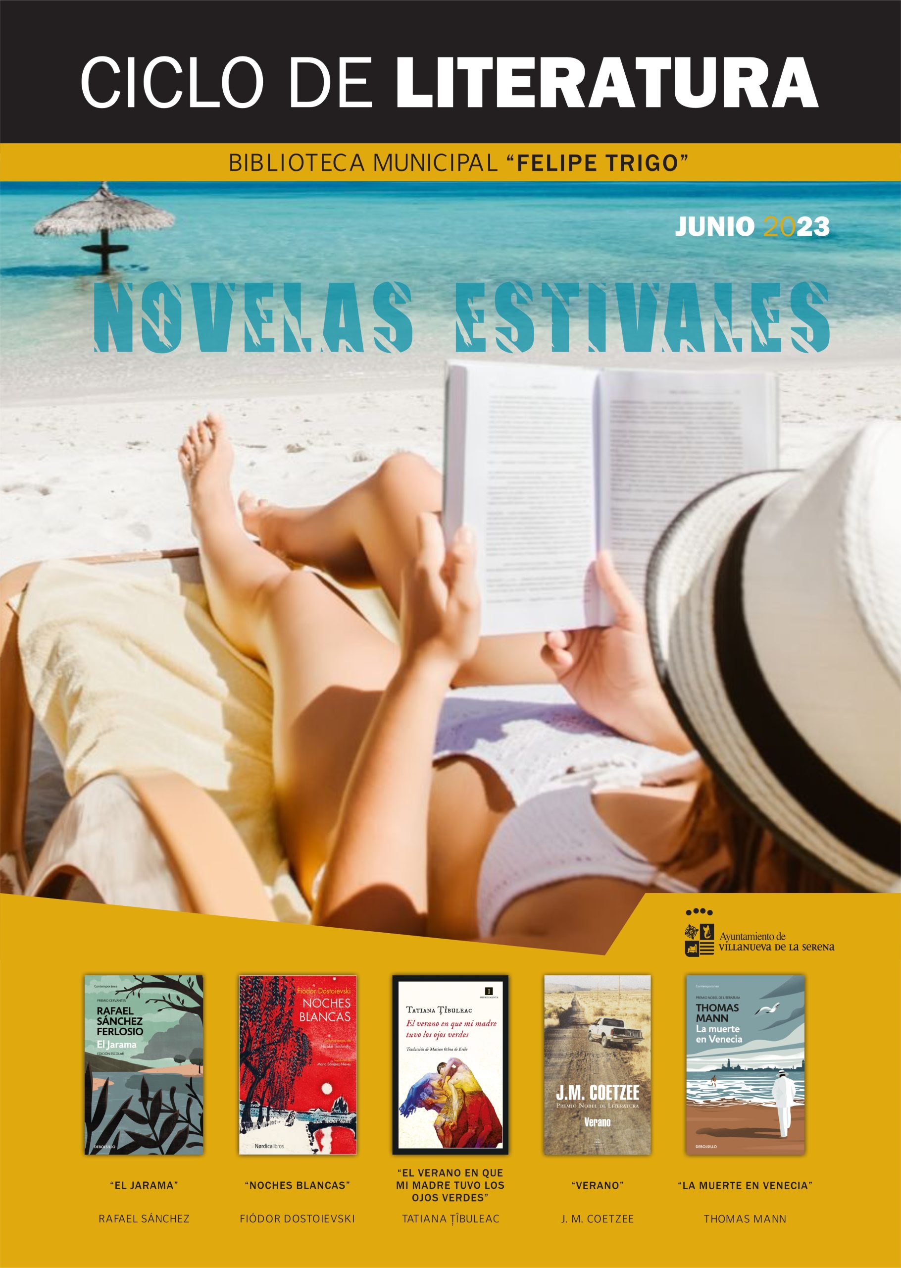 Cuatro son los títulos que se pueden encontrar en la biblioteca Felipe Trigo, “El médico”, “Chamán”, “La bodega” y “El último judío”. Con respecto al ciclo de literatura, en esta ocasión va destinado a novelas estivales. En ella, se incluyen “El jarama” de Rafael Sánchez, “Noches blancas” de Fiodor Dostoievski, “El verano en que mi madre tuvo los ojos verdes” de Tatiana Tibuleac, “Verano” de J.M. Coetzee y “La muerte en Venecia” de Thomas Mann.
