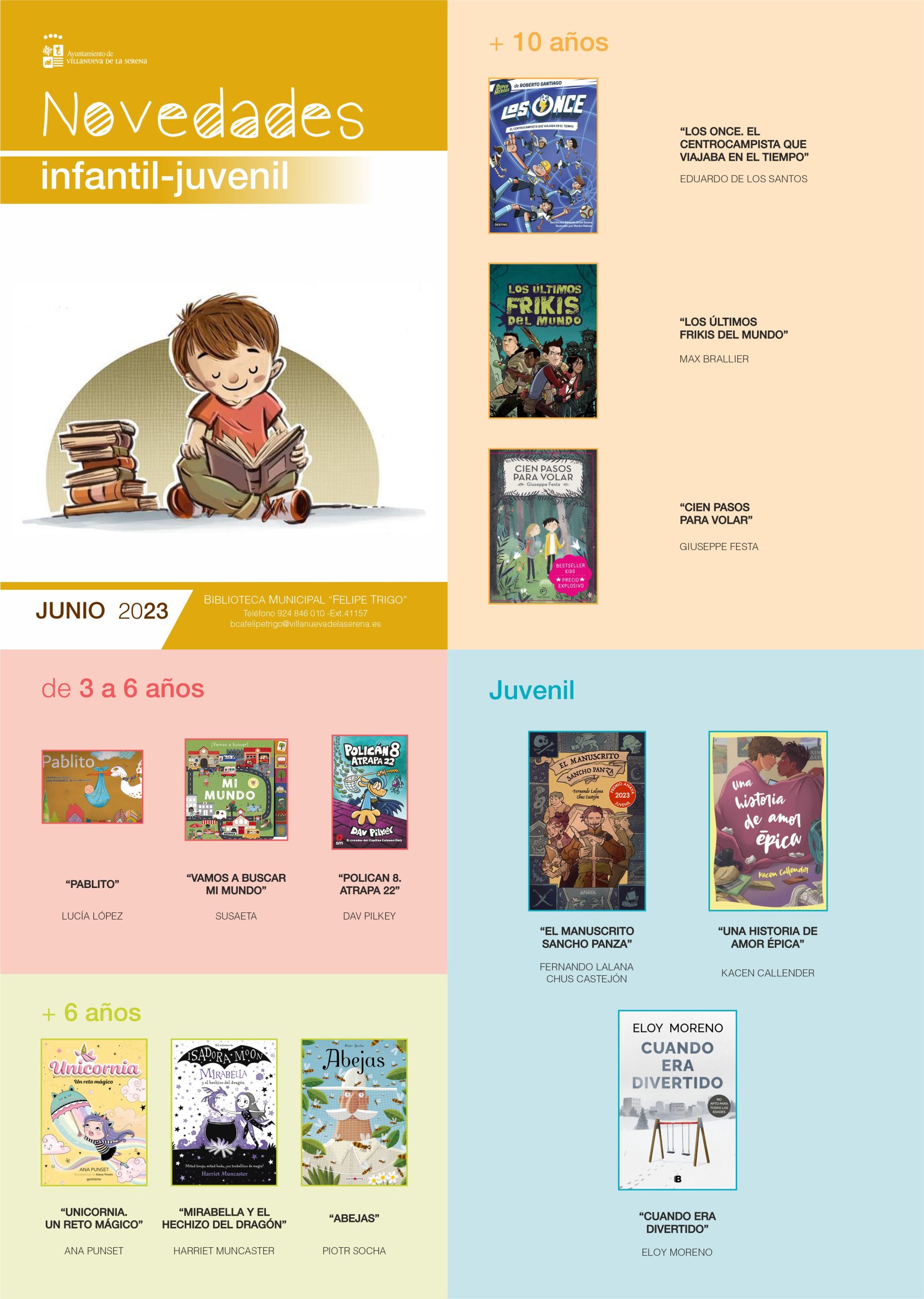 Con respecto a las novedades para el público infantil y juvenil se encuentra, “Pablito” de Lucía López, “Vamos a buscar mi mundo” de Susaeta, “Polican 8. Atrapa 22” de Dav Pilkey, “Unicornia. Un reto mágico” de Ana Punset, “Mirabella y el hechizo del dragón” de Harriet Muncaster, “Abejas” de Pior Socha, “Las once. El centrocampista que viajaba en el tiempo” de Eduardo de los Santos, “Los últimos frikis del mundo” de Max Brallier, “Cien pasos para volar” de Giuseppe Festa, “El manuscrito Sancho Panza” de Fernando Lalana y Chus Castejón, “Una historia de amor épica” de Kacen Callender y “Cuando era divertido” de Eloy Moreno.