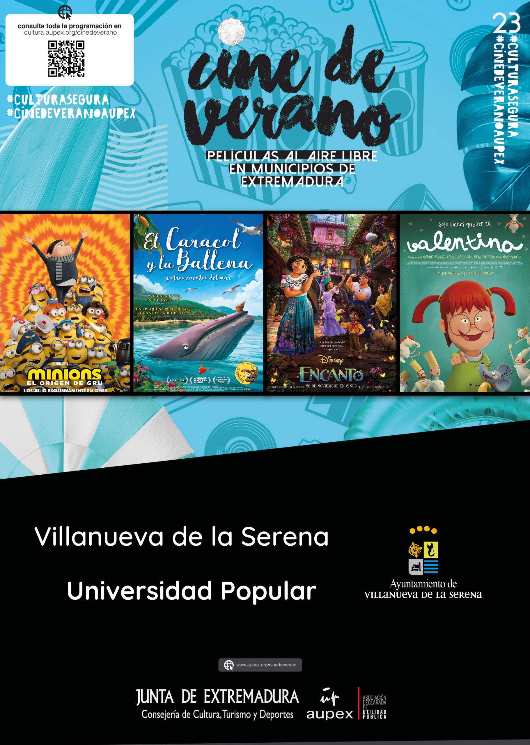 Otra cita ineludible del verano es el cine de verano. Una apuesta que se hace desde la Universidad Popular en colaboración con Aupex, y que se ha convertido en una entretenida actividad como punto de encuentro entre familias y amigos. Será en su habitual ubicación, en el auditorio del Parque del Rodeo y las proyecciones, serán los miércoles 2, 9, 16 y 23 de agosto, todas a las 22:00 horas. Los títulos seleccionados para esta ocasión son: “Minions, ha nacido un villano”, “Valentina”, “El caracol y la ballena” y “Encanto”.