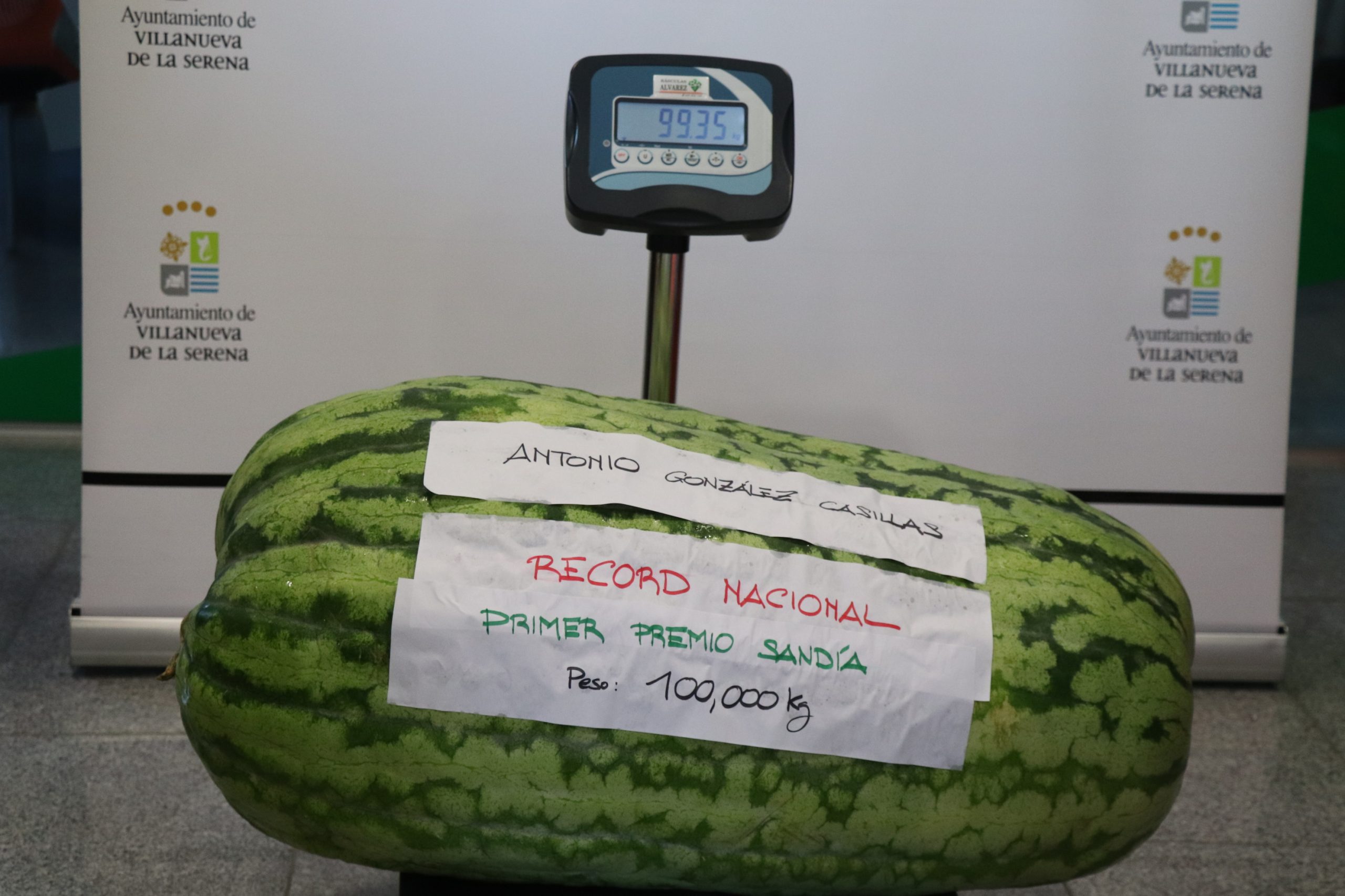 Este miércoles 3 de agosto se celebra el Día Internacional de la Sandía y es en Villanueva de la Serena, donde se encuentra el récord de la sandía más grande de España. Un título conseguido en 2019 gracias al Concurso de Sandía y Melón “Rufino Pineda Mendoza” enmarcado dentro de las Fiestas de San Bartolomé. La cosechó el villanovense Antonio González Casillas, que consiguió batir el récord con un fruto que pesó el día del concurso casi 100 kilos, algo que consiguió con “mucho mimo, trabajo y haciendo frente a la climatología, que no siempre es la adecuada”. Días después, dicho fruto fue pesado ante notario y aunque perdiendo algo de masa, finalmente el peso se fijó en 99 kilos 350 gramos.