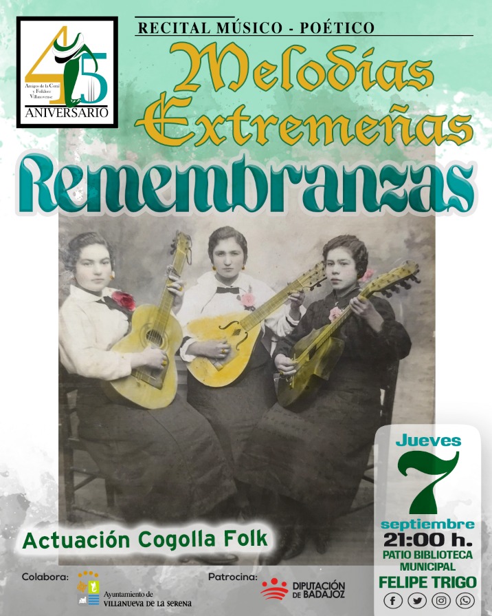 El próximo jueves 7 de septiembre, el grupo Cogolla Folk llevará a cabo un recital músico poético de melodías extremeñas denominado “Remembranzas”. Un acto que se llevará a cabo en la biblioteca Felipe Trigo a partir de las 21 horas, con el objetivo de dar a conocer nuestra región a través de música y literatura.