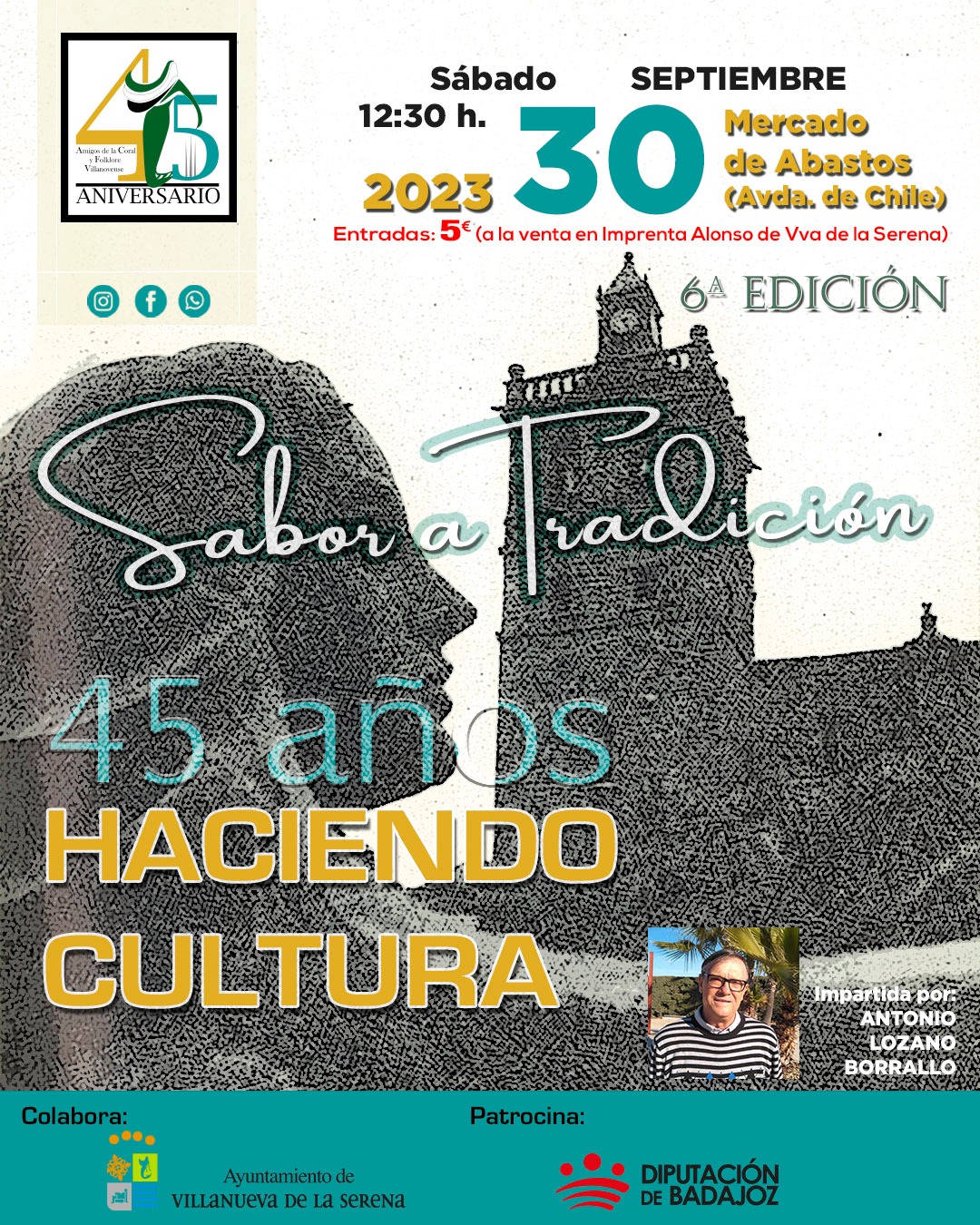 Bajo el título “45 años haciendo cultura”, se llevará a cabo una nueva edición de la actividad que organiza la Asociación de Amigos de la Coral y El Folklore Villanovense, Cogolla, denominada “Sabor a tradición”. Se trata de una charla a cargo de Antonio Lozano Borrallo que tendrá lugar a partir de las 12:30 horas en el mercado de abastos provisional al tiempo que el grupo Cogolla Folk, interpretará varios temas populares.