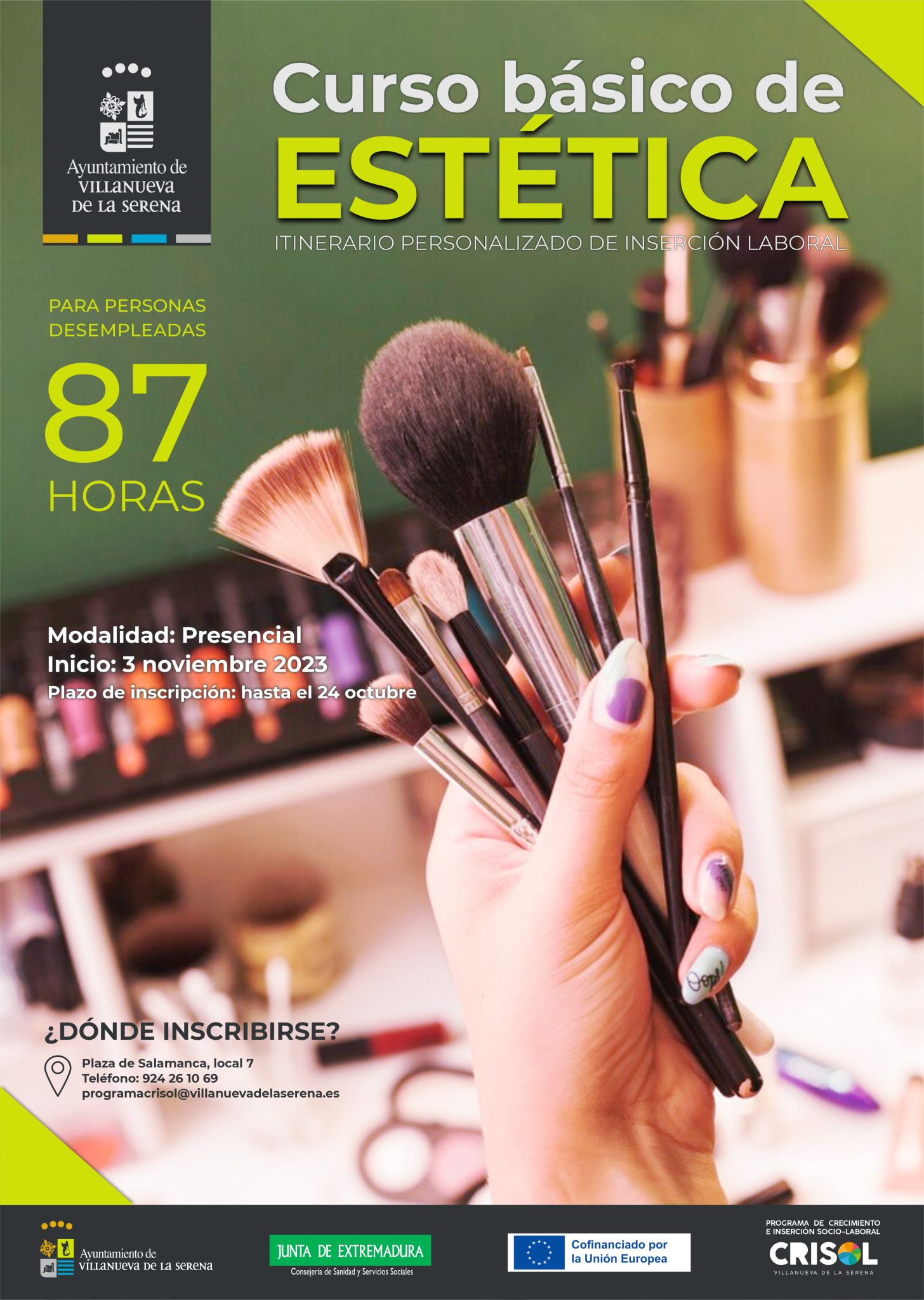 El programa Crisol pondrá en marcha el próximo 3 de noviembre, un curso básico de estética destinado a las personas desempleadas de la ciudad. Una acción formativa que cuenta con un total de 87 horas, tanto teóricas como prácticas donde los participantes adquirirán los conocimientos necesarios para ejercer la profesión.