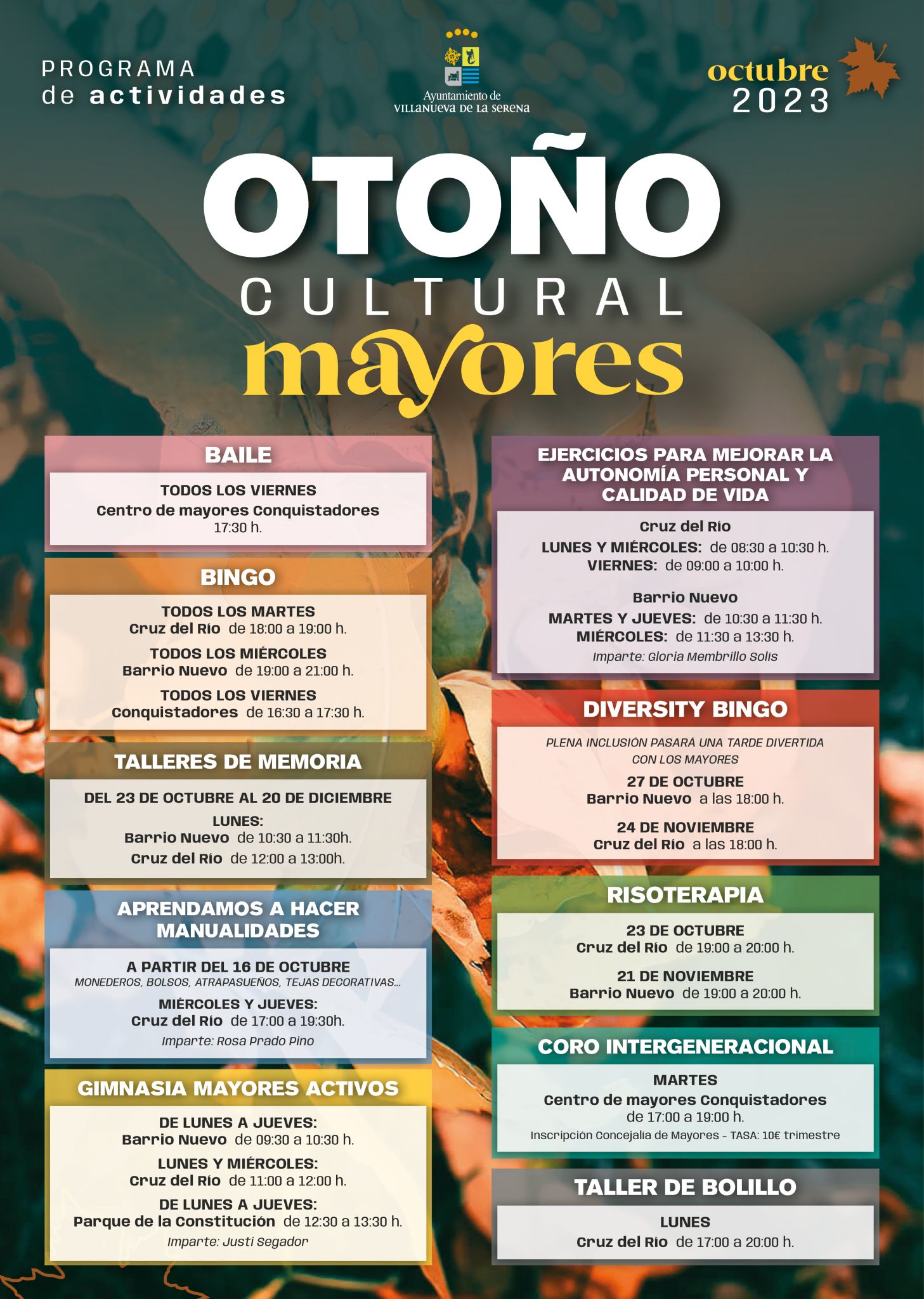 Bingo, risoterapia, talleres de memoria o gimnasia, son solo algunas de las actividades que, desde la concejalía de Mayores, se van a poner en marcha desde este mes de octubre hasta el mes de diciembre. Una programación, tal como explica Rosa Chamizo, concejala de Mayores, “amplia y que permitirá el disfrute de todos aquellos que deseen participar”.
